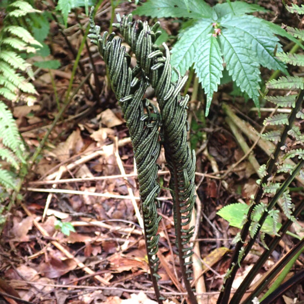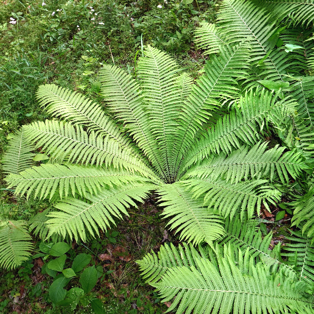 人里近くの湿った場所に多いシダ。 光合成をする葉は下ほど縮まる形をしていて、 葉裏に胞子のうをつけません。 胞子を飛ばす葉は小さく、 夏の終わりに出てきます。 放射状に葉をたくさん出す姿は草っぽいソテツに見えます。