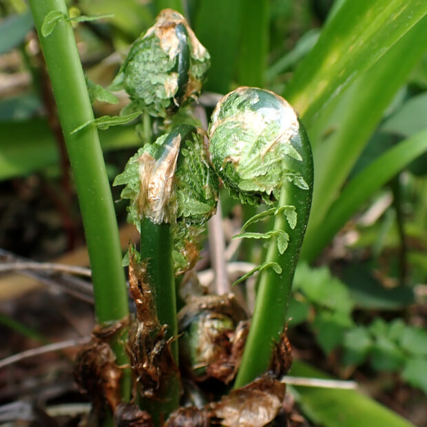 クサソテツの新芽は山菜名「コゴミ」で知られいて、 とても美味なシダです。 コゴミの名は人がかがんでいる姿に似ていることに由来します。