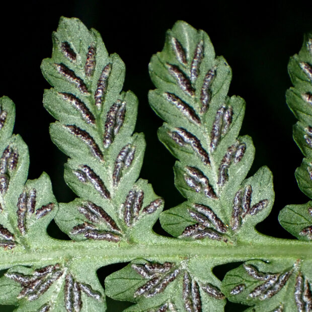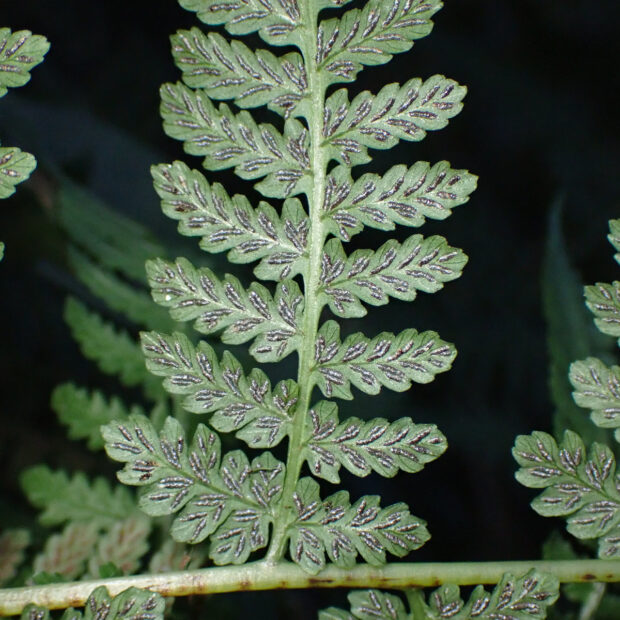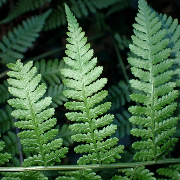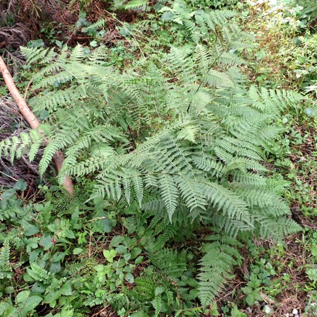 林内のやや湿った場所に多い大きめのシダです。 葉は草っぽくてやわらかいですが、 細かく切れ込んでいてちょっとした荒々しさも感じられます。 名前は日陰に生えることに由来しているとされます。 さらに大きいオニヒカゲワラビが似た場所に生えていることもあります。