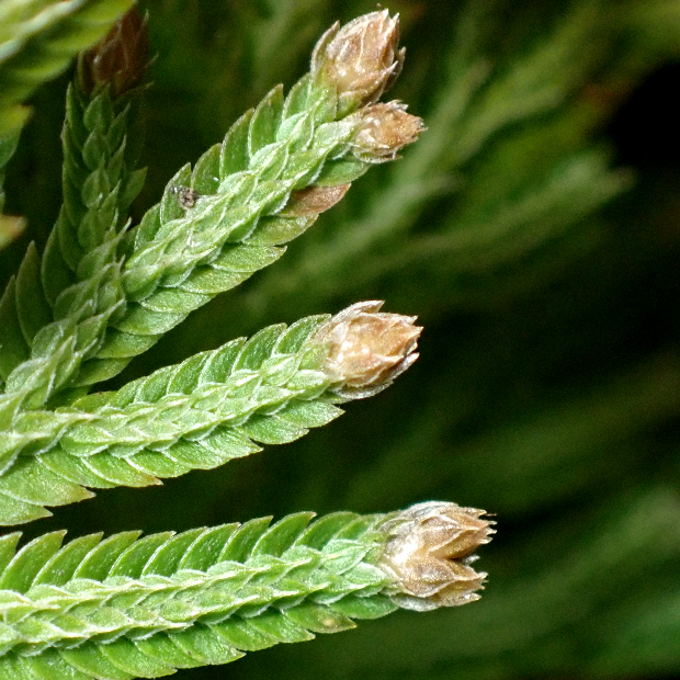 ●カタヒバは①枝先に無性芽はつけません。 ②枝はイヌカタヒバほど密につけず、 表面はツヤが強めです。 ③背葉は盛り上がって表面に数本の筋があり、 先はあまり長く伸びません。 ④紅葉はまれです。