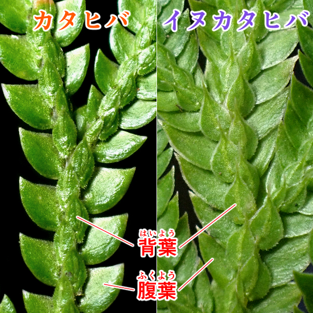 元から広く分布するカタヒバがよく間違われます。 カタヒバは山地に多くてあまり栽培されないので、 住宅地の石垣にモコモコと生えていたら大体イヌカタヒバですが、 それ以外にも例えば以下のような違いがあります。 じっくり観察してみましょう。