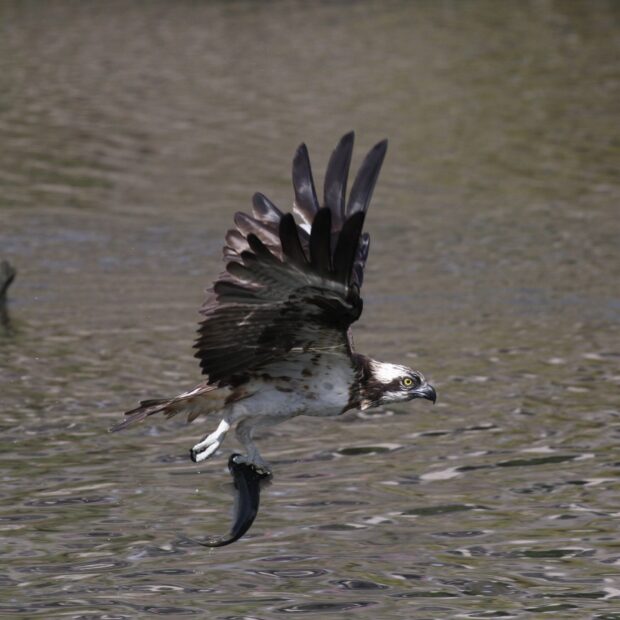 ホバリングをしながら魚を探し、 急降下で水面近くの魚を掴み上げます。