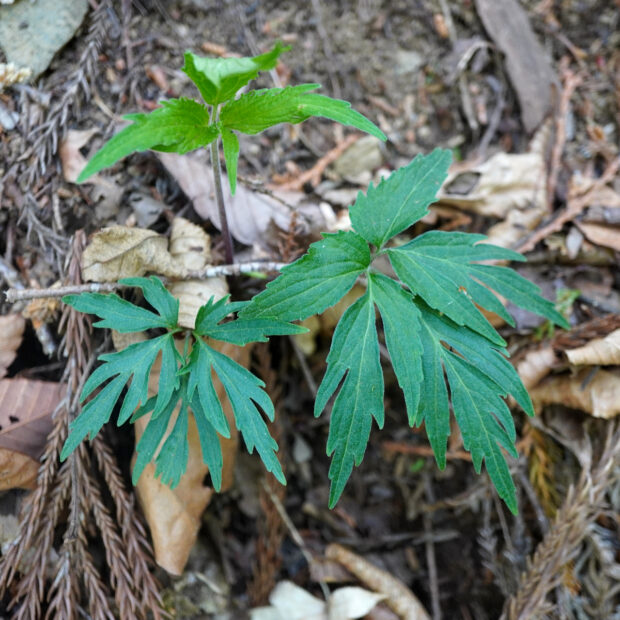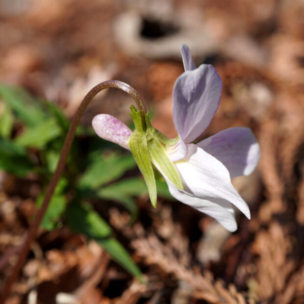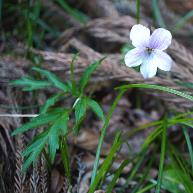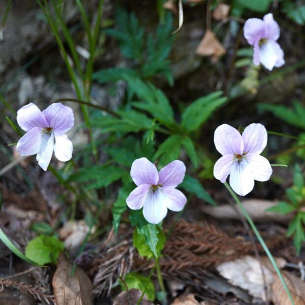 山地林内によく見られるスミレ類です。 花は大きめでピンク色っぽく、 葉は細かく裂けるのが大きな特徴です。 名前は京都と滋賀の府県境に位置する比叡山(ひえいざん)にちなみます。 (SI)