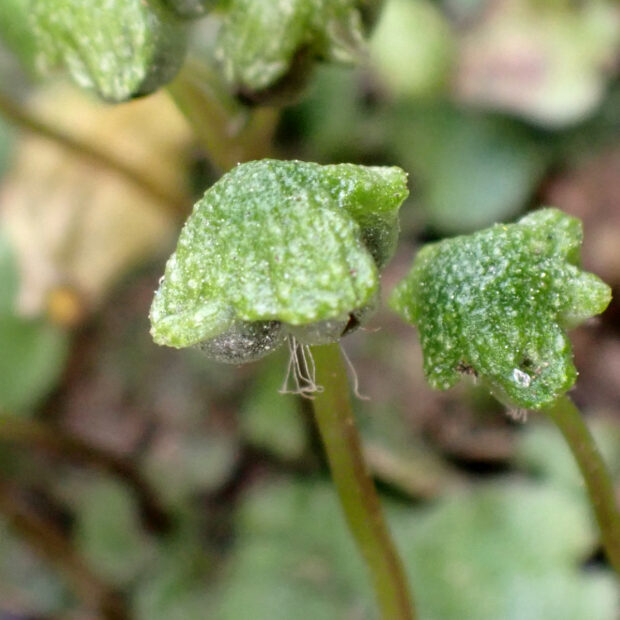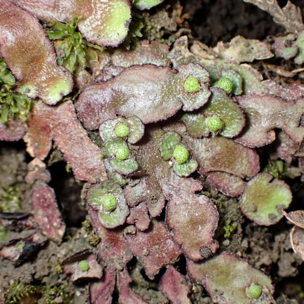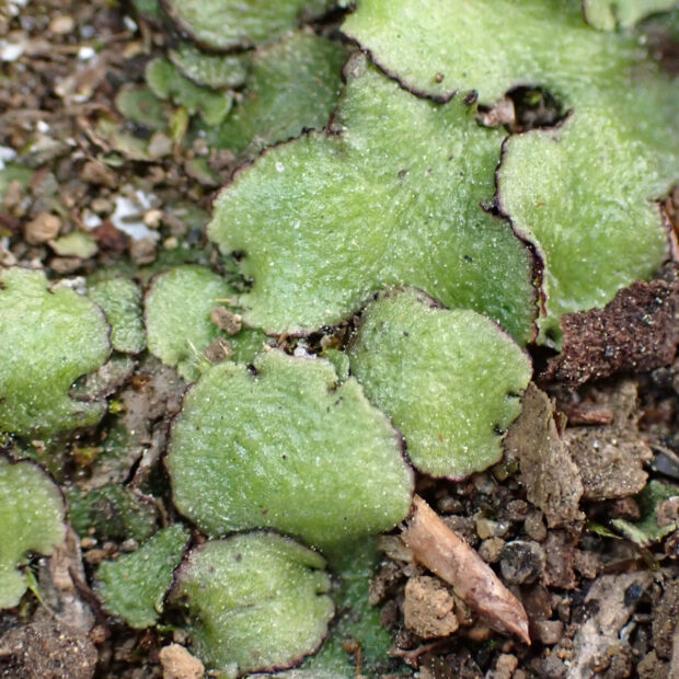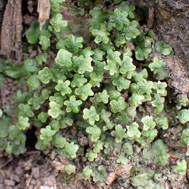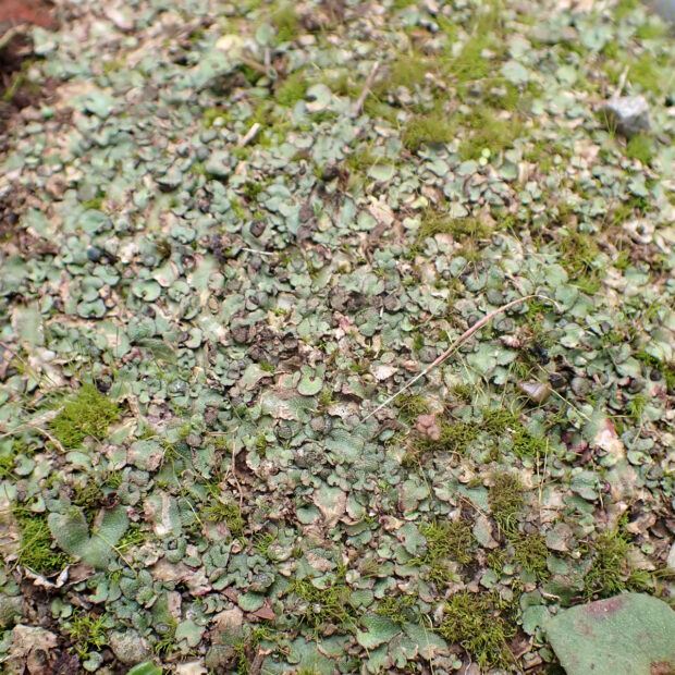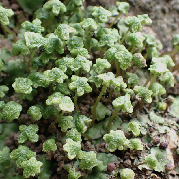 市街地でも公園などの地面によく生えている身近なコケ。 陣笠(じんがさ)は主に戦国時代に使われていたかぶり物のことで、 それに似た形の雌器托(しきたく)を春頃からつけます。