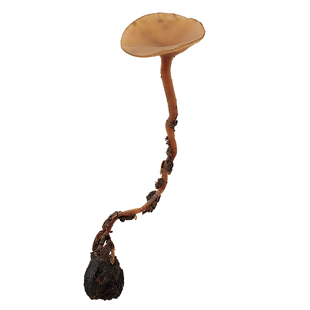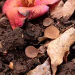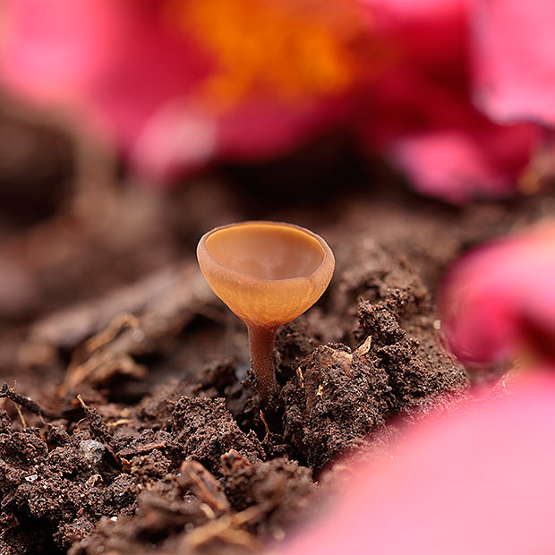 地面に落ちたツバキの花を分解して黒い菌核をつくります。 ツバキの花が咲く早春になると菌核からきのこが生えます。