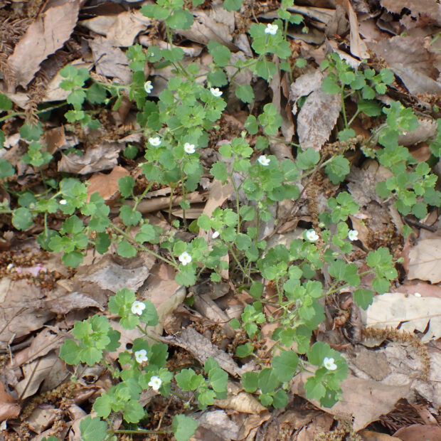 ヨーロッパからやってきた外来種です。 オオイヌノフグリに似ていますが、 花は白く、 茎にはまばらに長い毛が生えています。 名前は同じく白花を咲かせるハマウツボ科のコゴメグサに似たイヌノフグリという意味です。