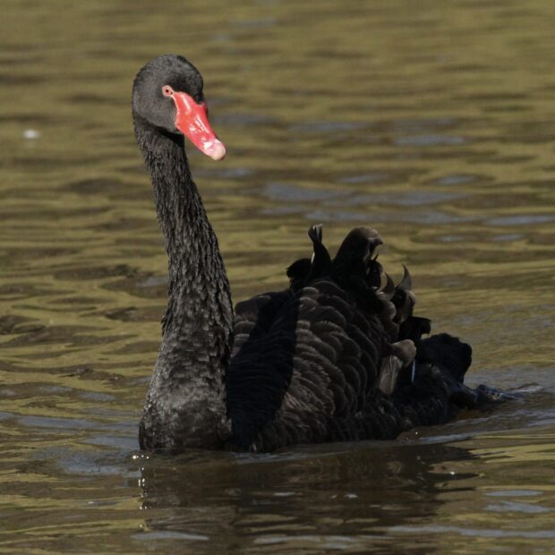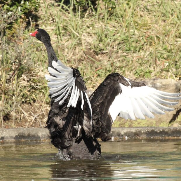 公園などの池などでも見ることができ、 水草などを食べて生活しています。 名前の通り真っ黒な体をしていて、 嘴は赤色です。 羽ばたくと、 風切り羽が白く目立ちます。