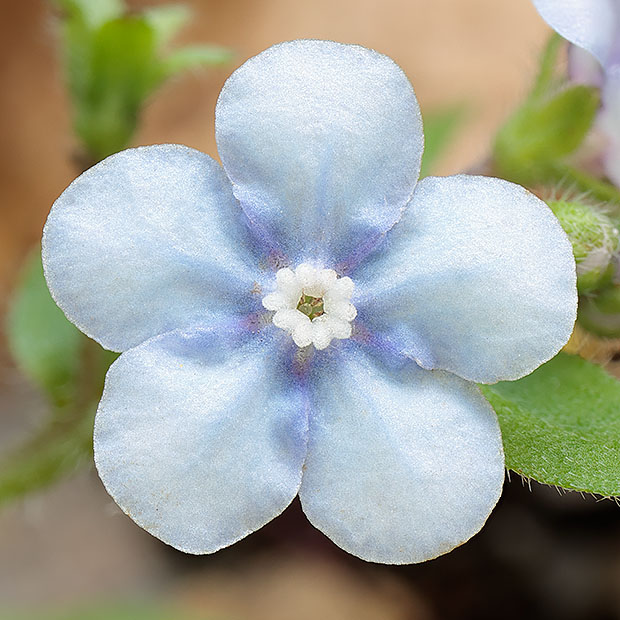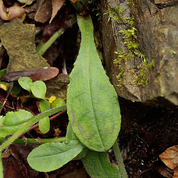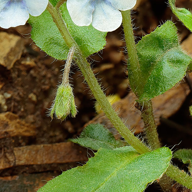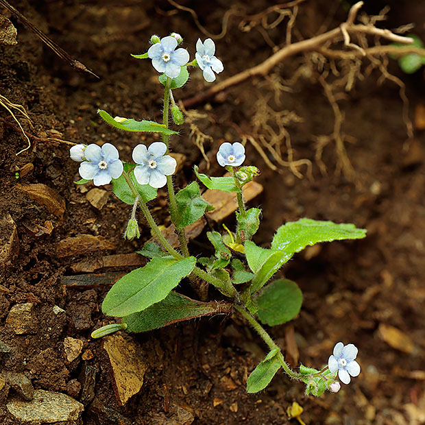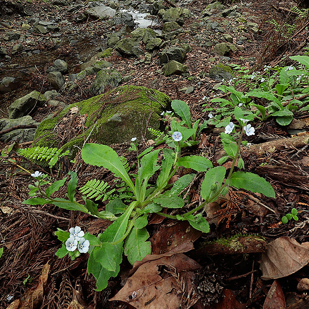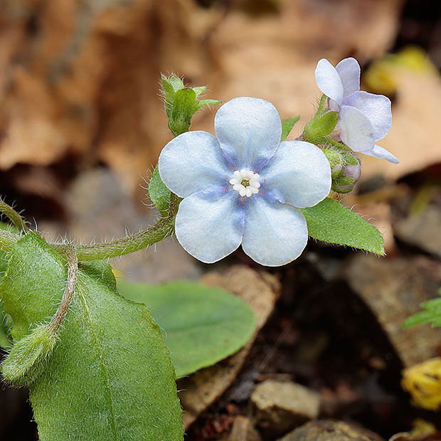 春に低山をハイキングしてると出会えます。 根もとに葉をたくさんつけ、 茎を数本だしてるり色の花を咲かせます。 ルリソウににています。