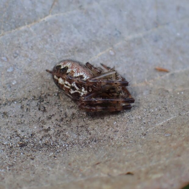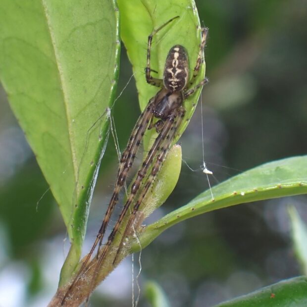 水平円網を張るアシナガグモの仲間。 平地~山地の公園の池や渓流沿いなど、 幅広い環境の水辺近くで見られます。 「メガネ」は頭胸部のメガネのような模様、 「ドヨウ」は夏の土用の頃に多く見られることから名づけられました。