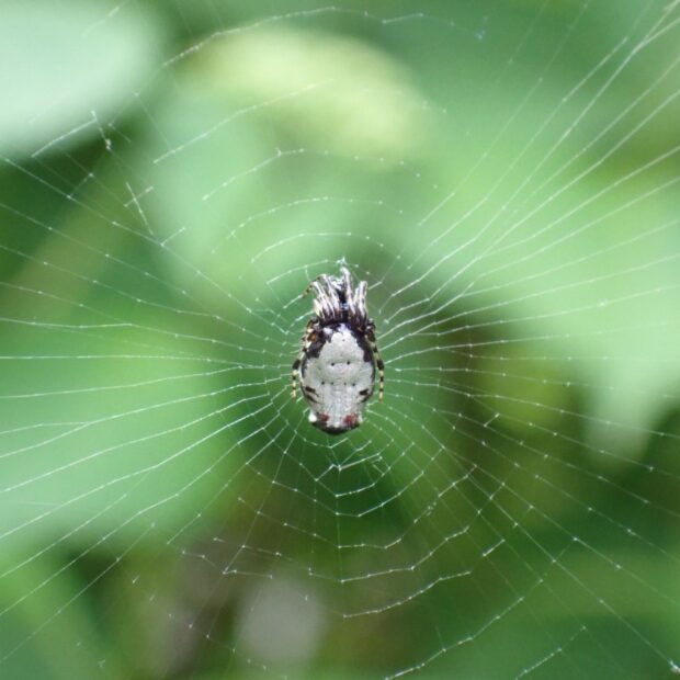 コガネグモの仲間。 都市部の公園で普通に見られる銀色のクモ。 うす暗い所に垂直のまるい網をはり、 頭を上にしてとまります。 網にかくれ帯をつけたり、 ゴミを並べることがあります。