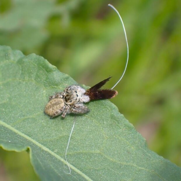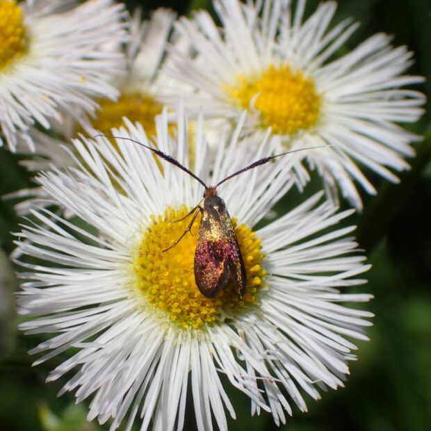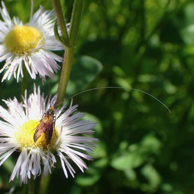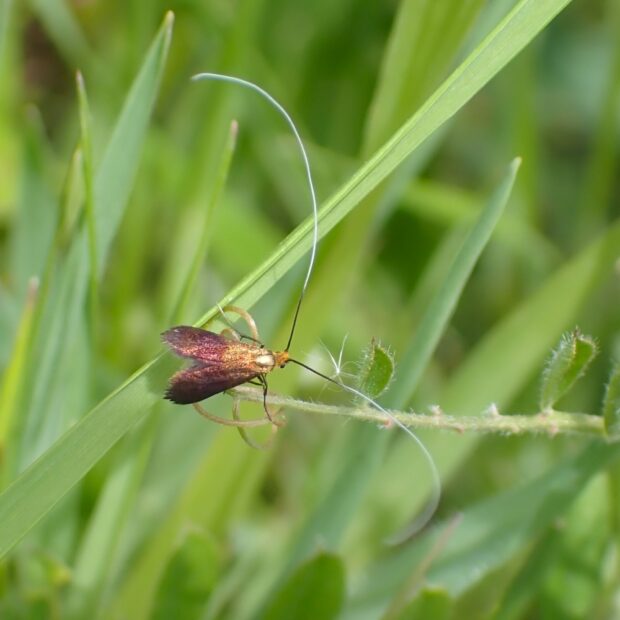 草地で見られるヒゲナガガの仲間。 長い触角でバランスをとっているかのように、 フワリフワリとゆっくり飛んではとまります。 メスはオオスズメノカタビラなどイネ科植物の茎に産卵します。