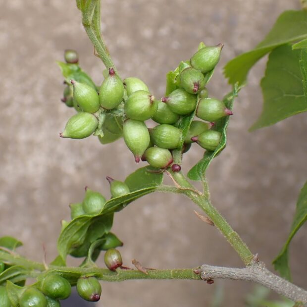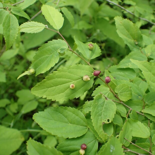 エノキトガリタマバエがエノキの葉や葉柄に作った虫こぶ。 虫こぶは擬宝珠(ぎぼし)のような形をしています。 5月下旬頃、 虫こぶは落下し、 幼虫は落下した虫こぶの中で翌春まで過ごし、 3~4月に成虫になります。