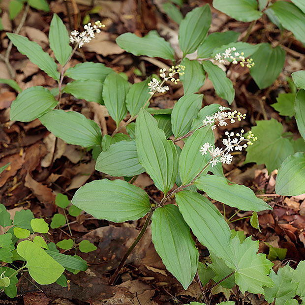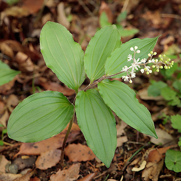 茎の頂部に雪のように白い花を咲かせます。 葉は幅の広い笹の葉のような形をしています。 赤い実が実ります。