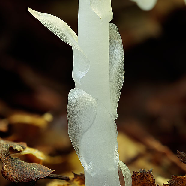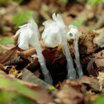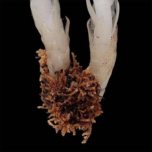 葉緑体をもたず、 全体が白色です。 光合成で栄養を作らない代わりに、 ベニタケなどのきのこから栄養を得ています。