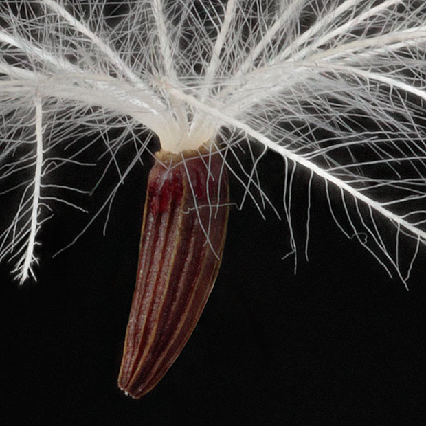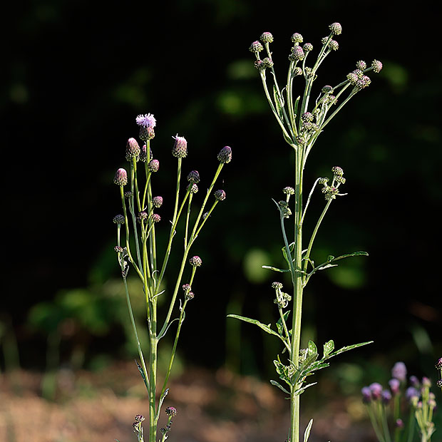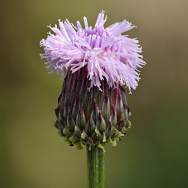 アザミのように見えるけど、 とげをもちません。 まるできつねにばかされた気分です。 キツネアザミ属に所属します。 ヒレアザミ属の実は15本の筋があるが、 ノアザミなどのアザミ属は実に筋がありません。