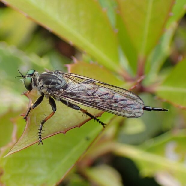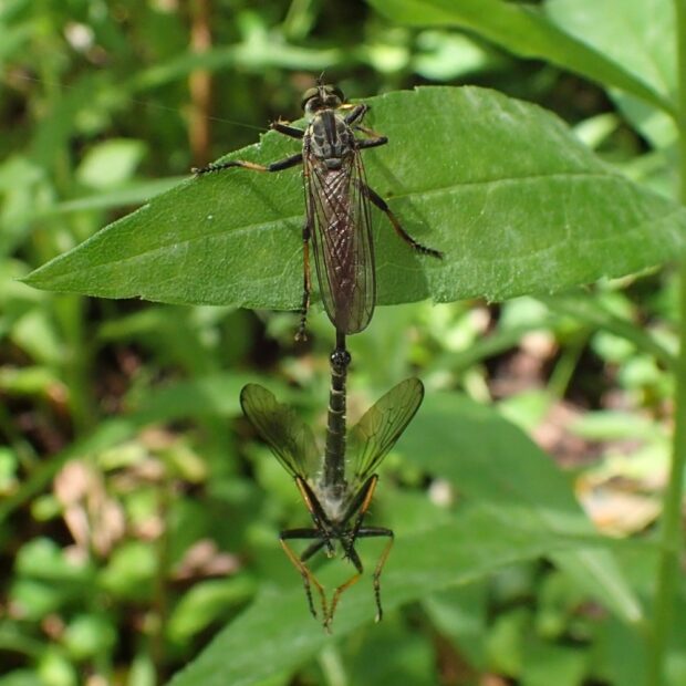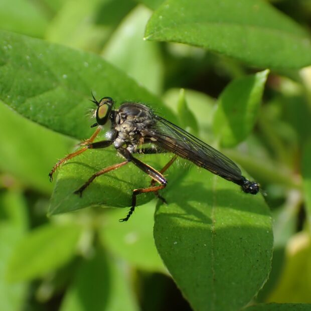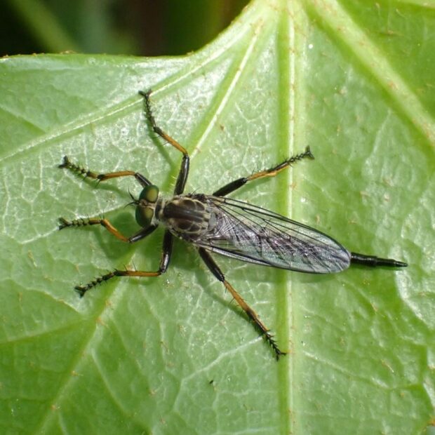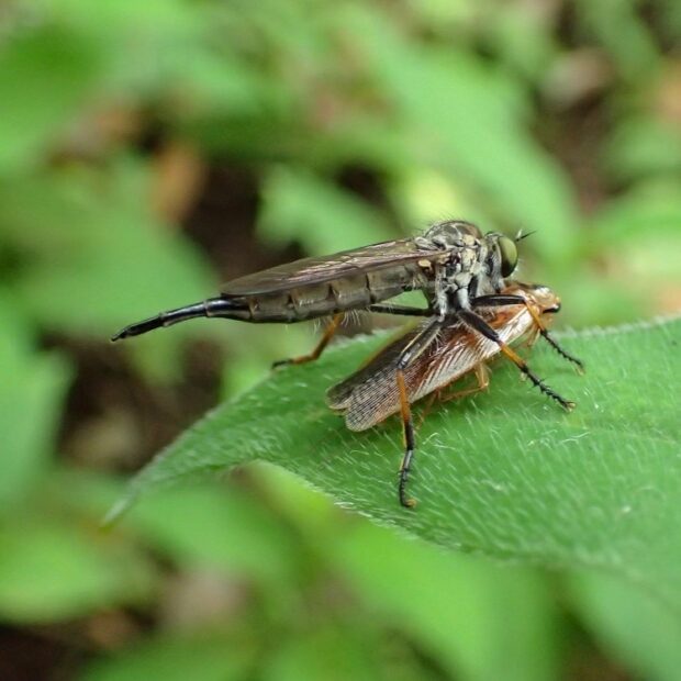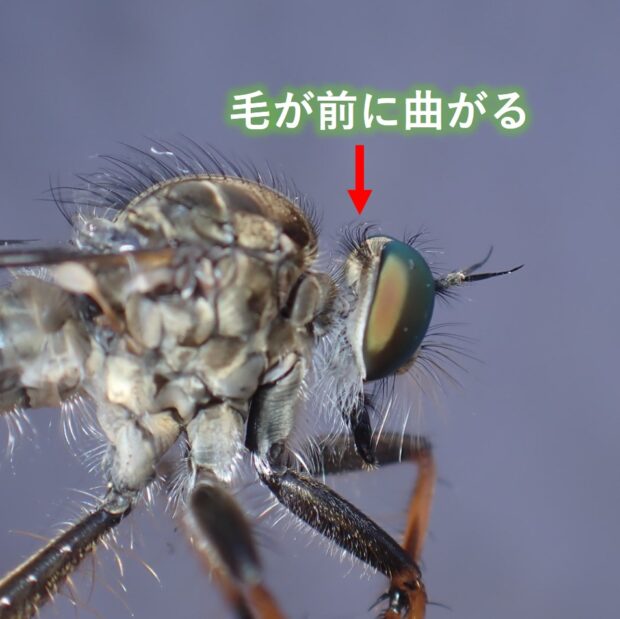 昆虫などを捕えて食べるムシヒキアブの仲間。 頭の後ろに長い毛があり、 この毛が曲がっていることから名前がつけられました。