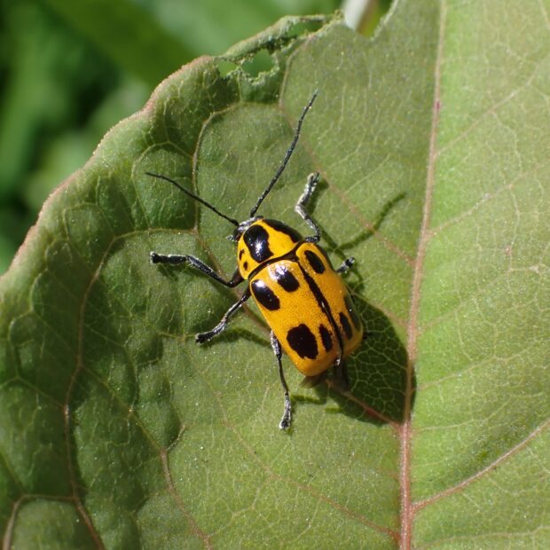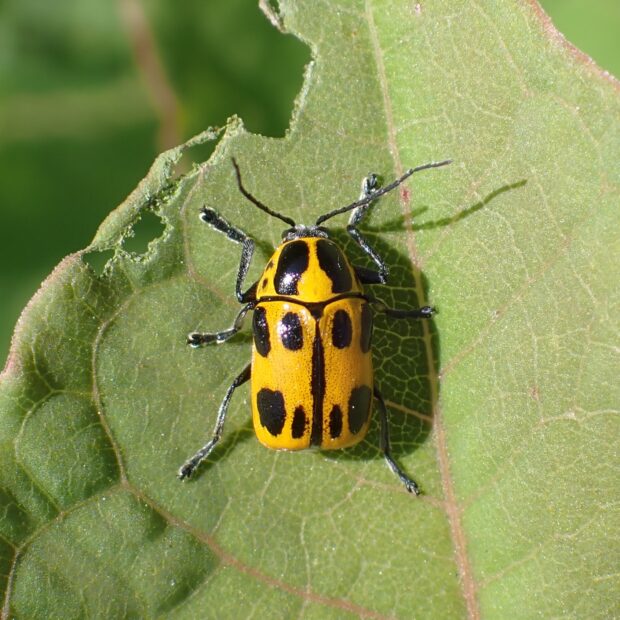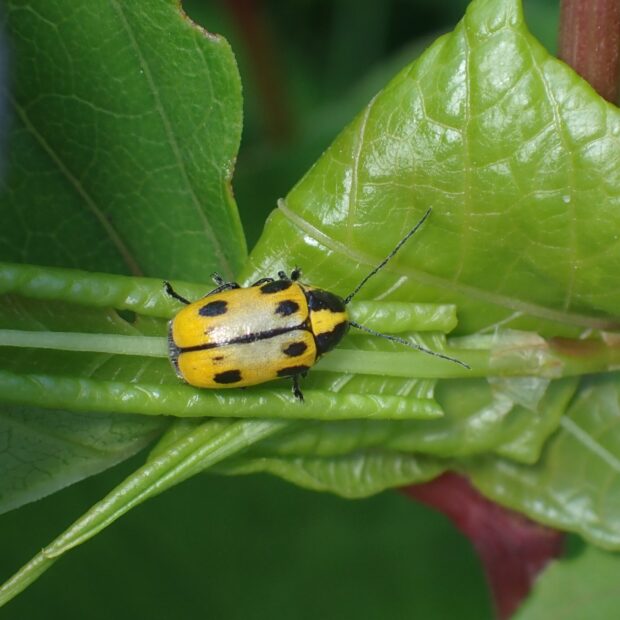 黄色い前ばねに黒い紋が8個あるツツハムシの仲間。 紋の数や形は個体差があり、 紋が8個ないのもいます。 卵はフンでつつまれ、 幼虫はフンのケースに入っています。