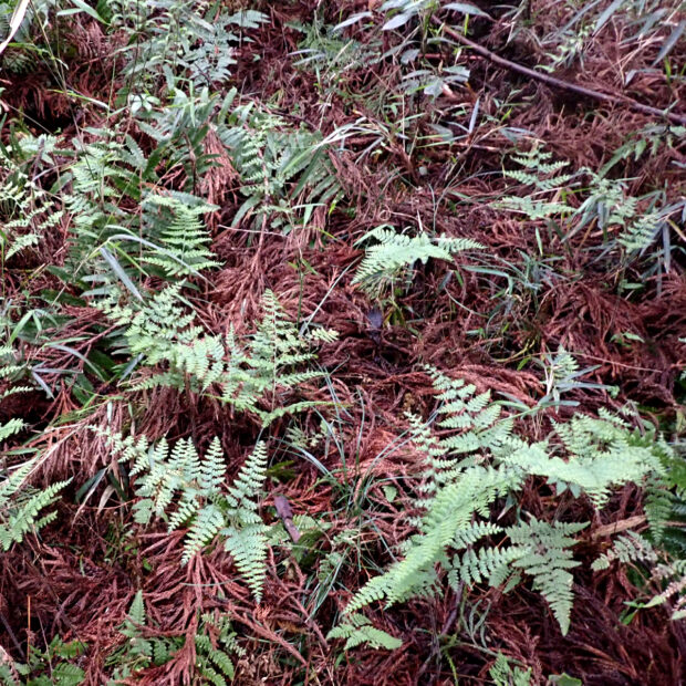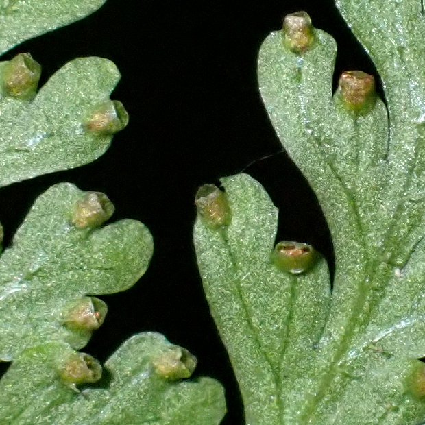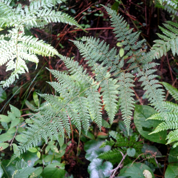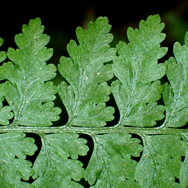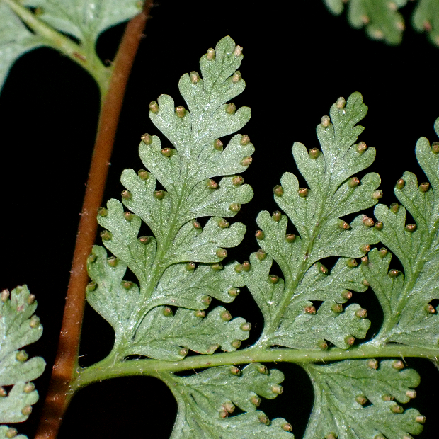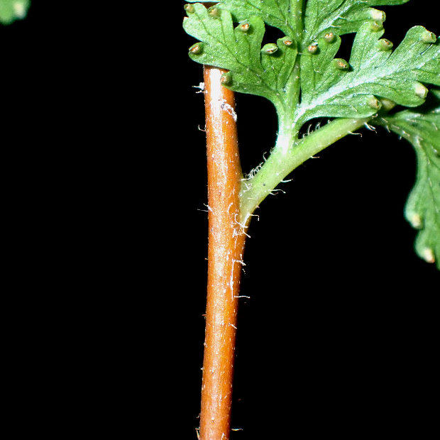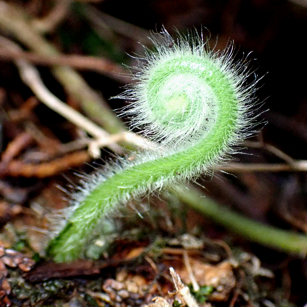 暖かい地域に多いシダです。 葉は長めの三角形で細かく切れ込み、 葉柄などに長い毛が多いのが特徴です。 名前は小さめのイシカグマという意味ですが、 大きさよりも葉形や切れ込み方などの点でイシカグマとはあまり似ていません。