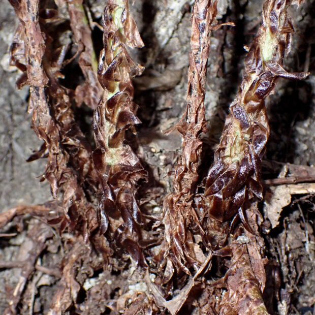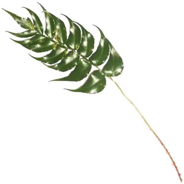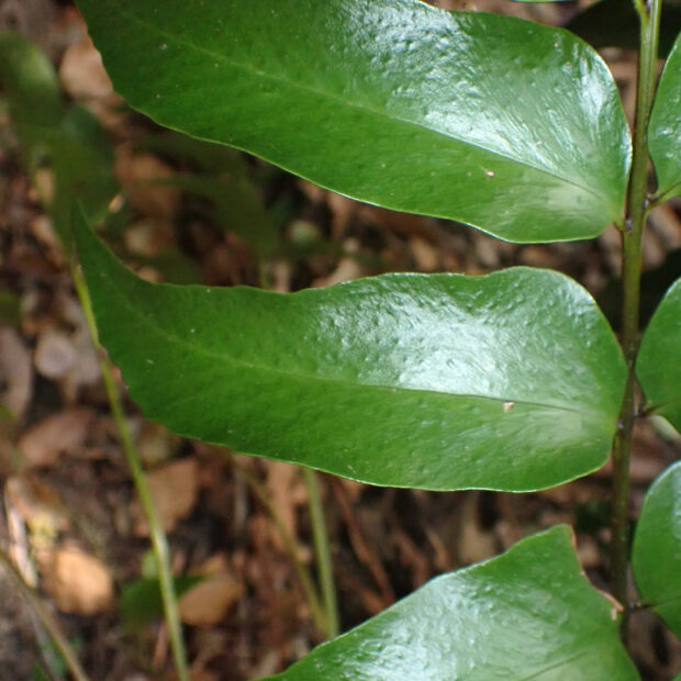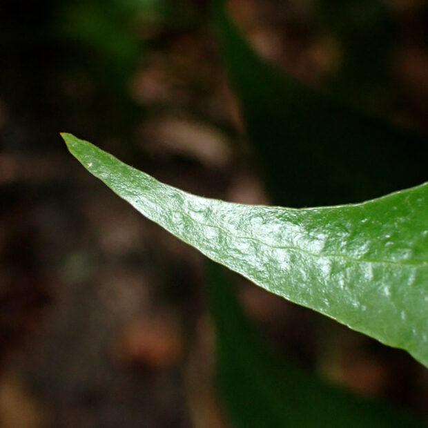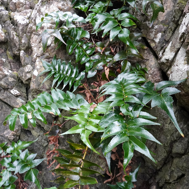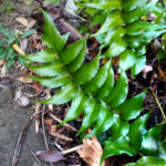 濃緑色でテカテカの海岸近くに多いシダ。 内陸寄りに多いナガバヤブソテツよりも葉は厚みがあり、 羽片は基部で一番幅広く、 先に行くにしたがって細くなっていきます。 庭園によく植えられる、 人との関わりが深いシダの1つです。