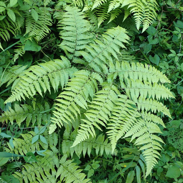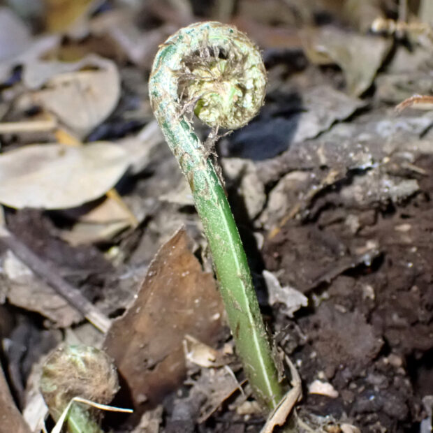 暖かい地域の林内などに群生していることが多い大きなシダです。 似た仲間が多くありますが、 本種は胞子のう群が葉のフチと脈の中間につき、 葉柄基部に茶色の鱗片がわずかにあることなどが特徴です。 名前は鹿児島市の城山に由来します。