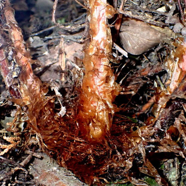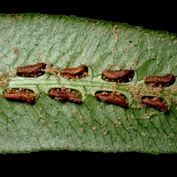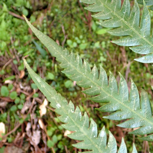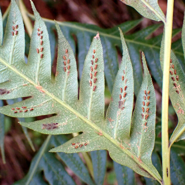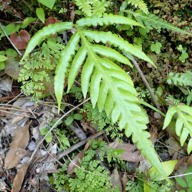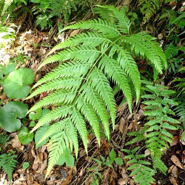 ●コモチシダは①ハチジョウカグマほど大きくならないことが多く、 ②羽片や小羽片の先はあまり長く伸びず、 ③若葉は紅色にならず、 ④やや北方でも見られます。