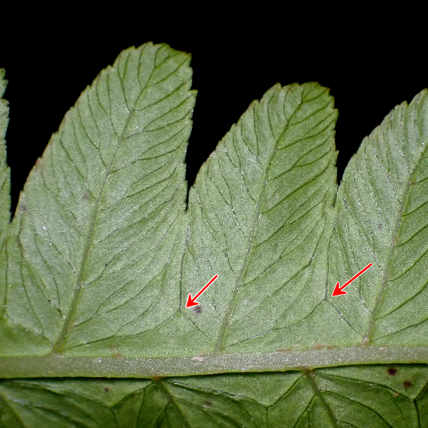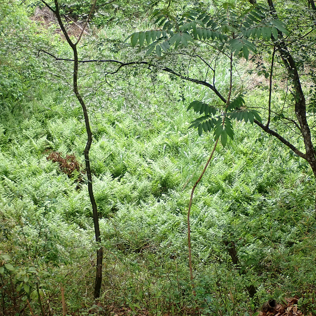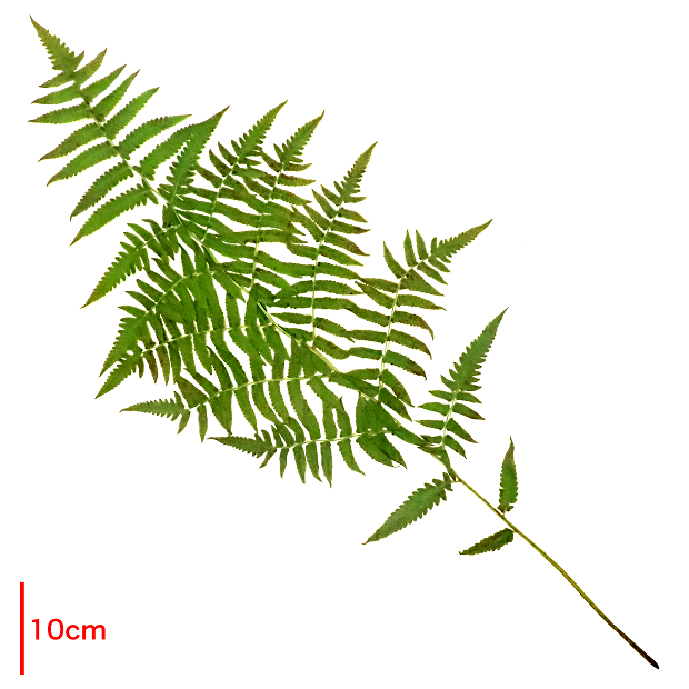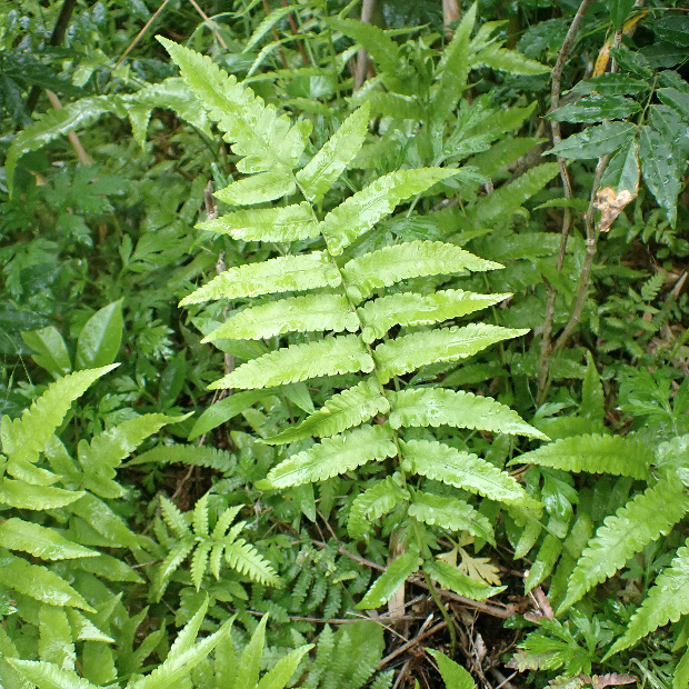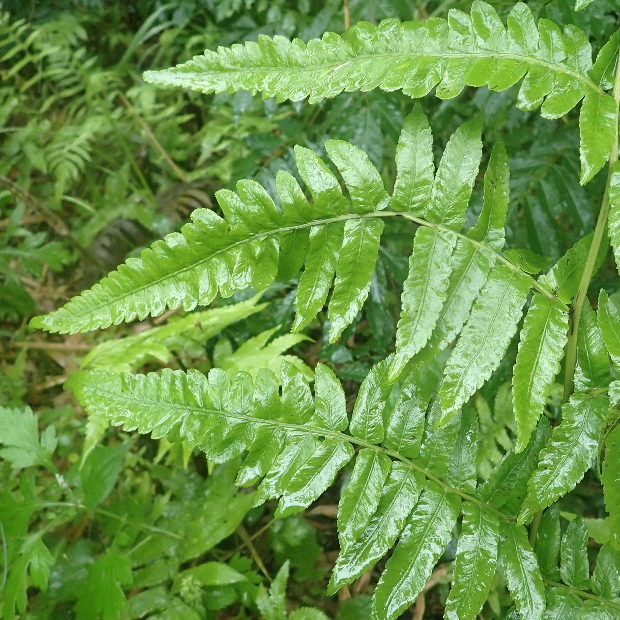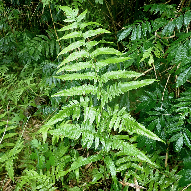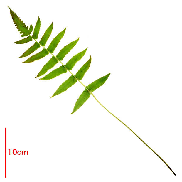 おいしそうな名前をした大きなシダ。 日本では九州と沖縄の一部に生え、 増水で水没するような川沿いを好みます。 葉はタテに長く、 中央部でもっとも幅広くて切れ込みが多くなります。 小さめの葉は先が長く伸びていてホシダに似ています。