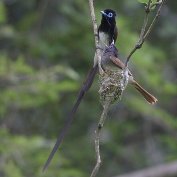 オスは体に対して非常に長い尾羽を持ち、 オスメスともにアイリングと嘴がが綺麗なコバルトブルーをしています。