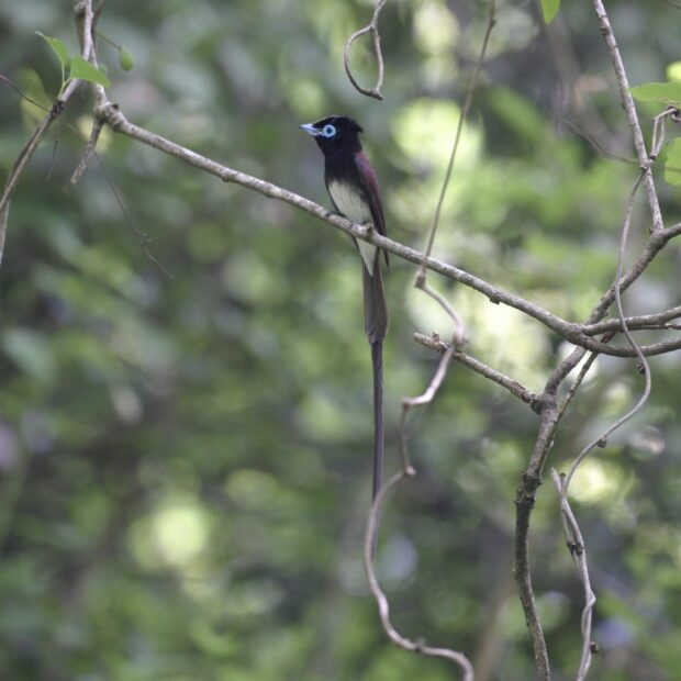 コバルトブルーの美しいアイリングと長い尾羽を持つ鳥