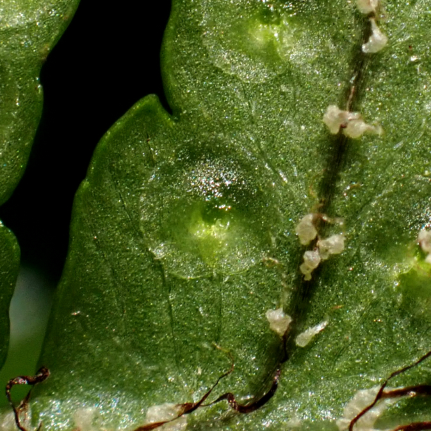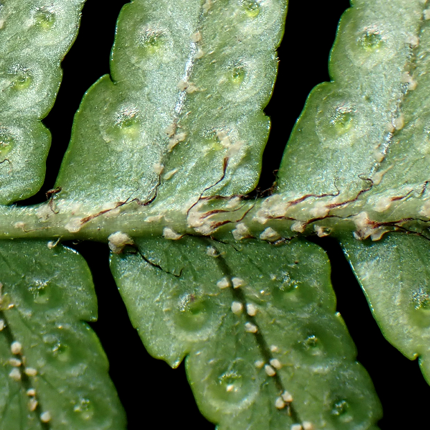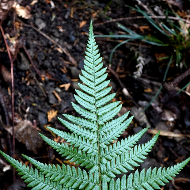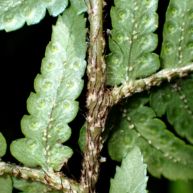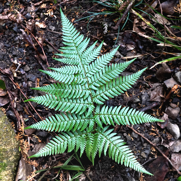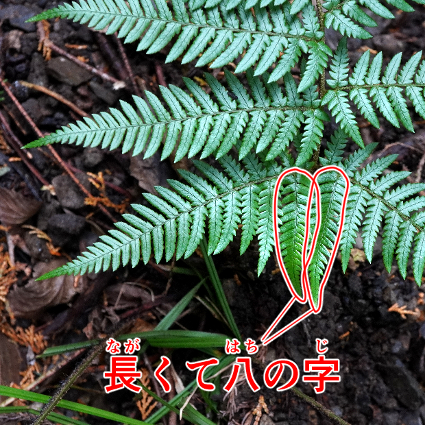 都市公園でもよく見られる身近なシダ。 イタチシダ類は葉の中央一番下の切れ込み2本が八の字に伸びます。 その中でも本種は、 葉が厚くて革っぽく、 葉幅が広めで、 切れ込み先のフチにはっきりとしたギザギザ(鋸歯)があります。 葉柄にたくさんつく鱗片がイタチに例えられました。