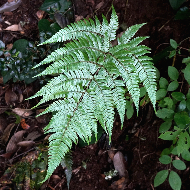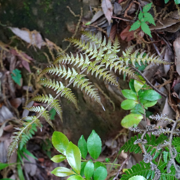 上のスライドは葉のフチが内側に巻くアツバオオイタチシダといわれるタイプです。 そのほかにも、 葉が黄緑色でツヤがないものはツヤナシオオイタチシダ、 葉が平面的でツヤのあるものはアオニオオイタチシダと呼ばれています。 以前までこの1つに含まれていたベニオオイタチシダは、 2018年に新種として独立しました。