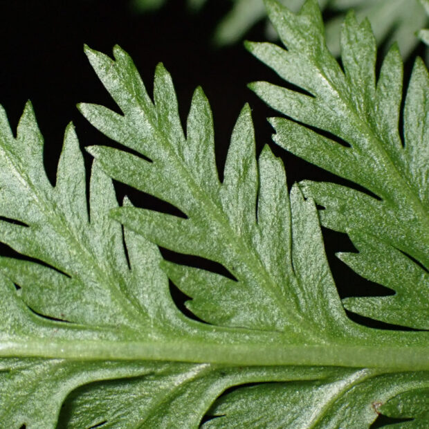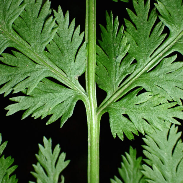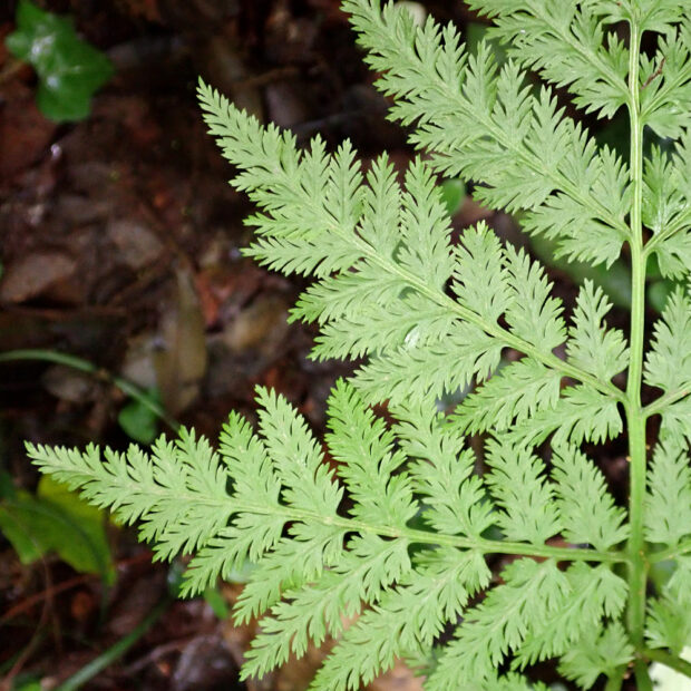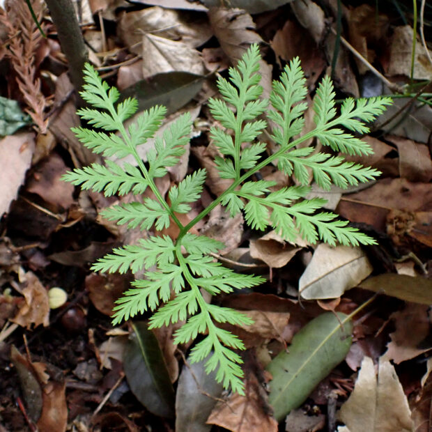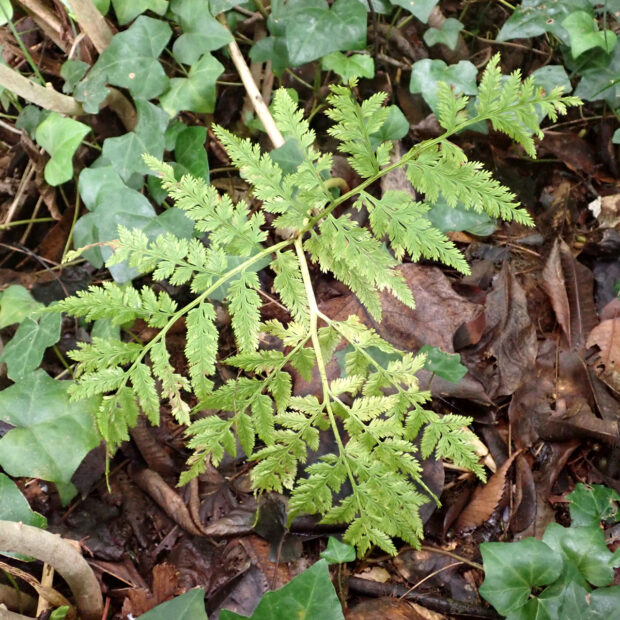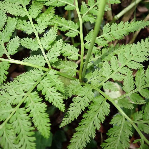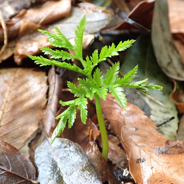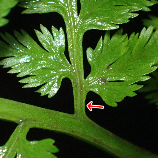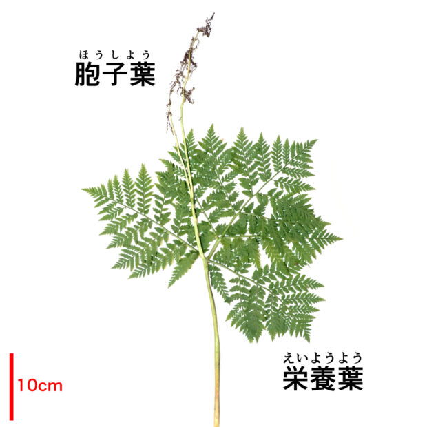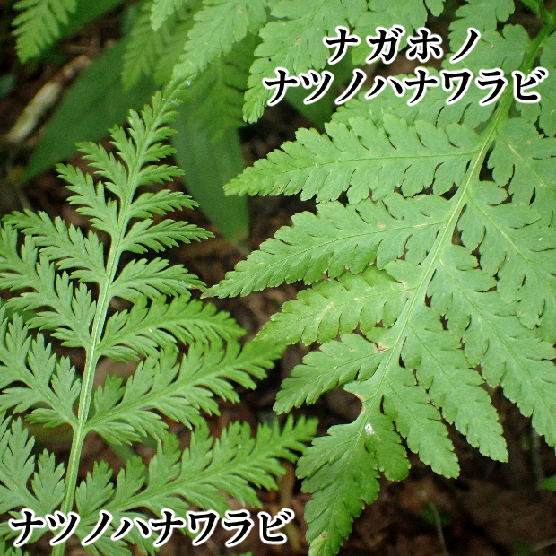 ●ナガホノナツノハナワラビは栄養葉の切れ込みが浅めで先はあまり尖りません。 ②胞子葉の羽片は短めであまり横に広がりません。 ③柄などに毛が多くつきます。