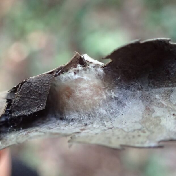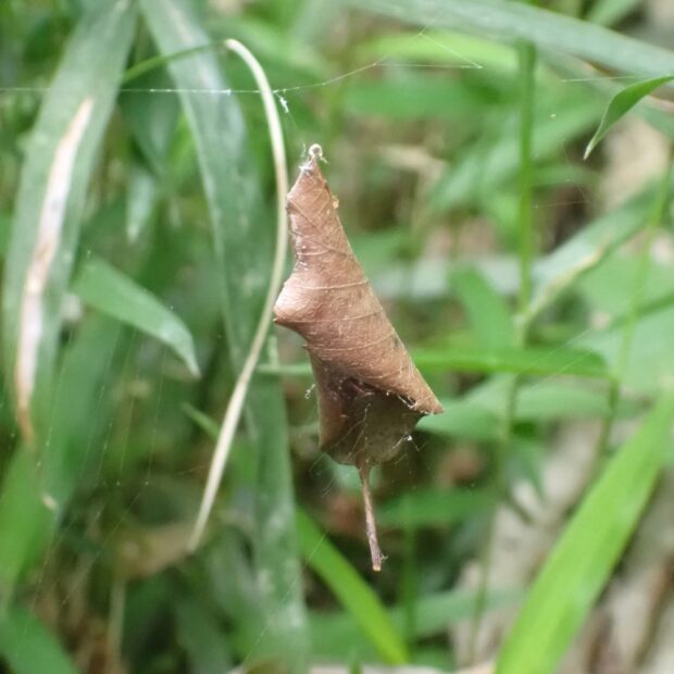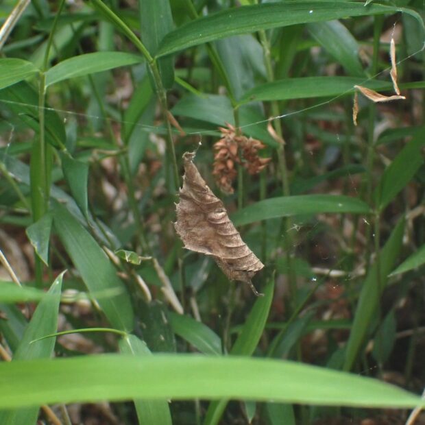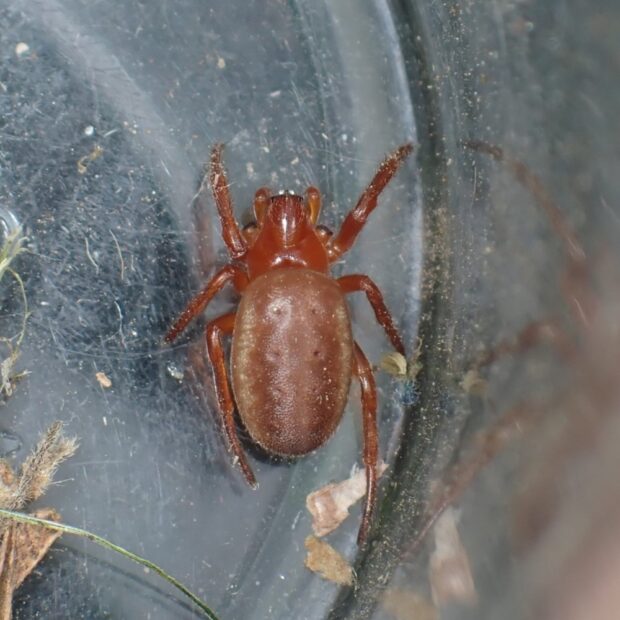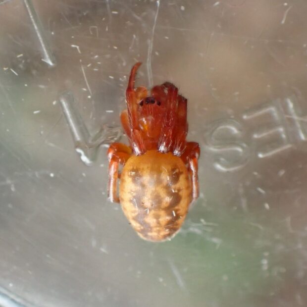 コガネグモの仲間。 赤褐色のずんぐりしたクモ。 薄暗い環境で見られ、 地面に近い、 木や草の根元近くに円網を張ります。 網の中心に枯れ葉をつるし、 その中に隠れています。