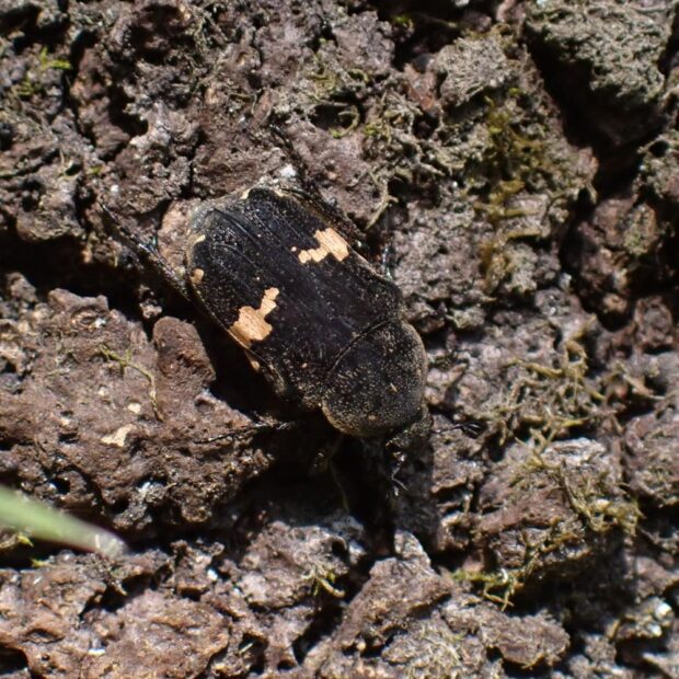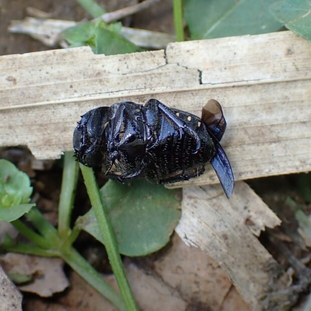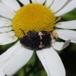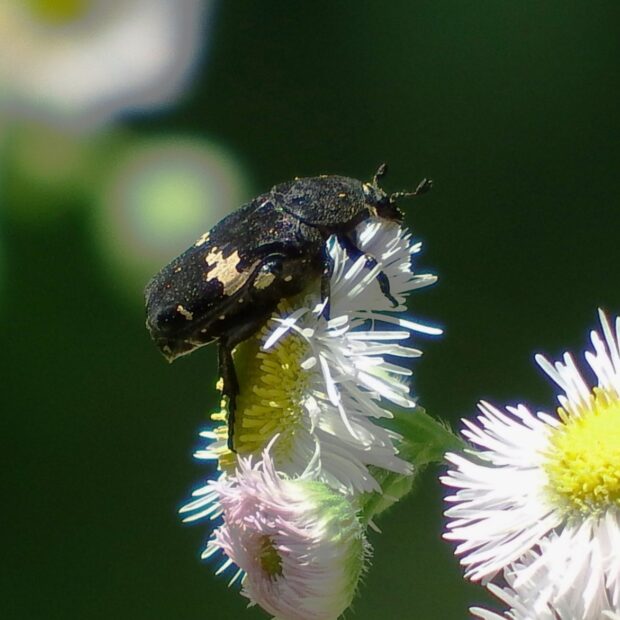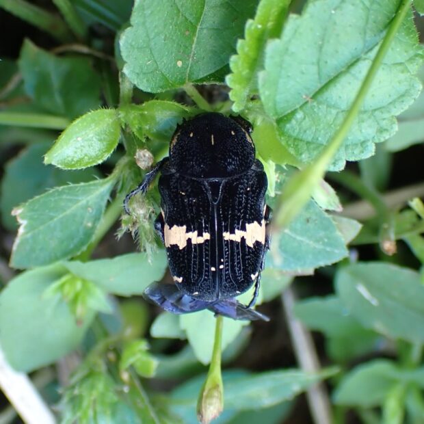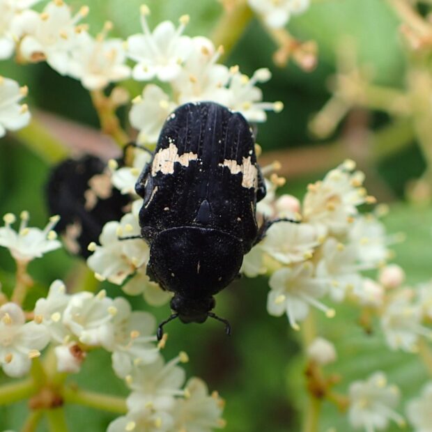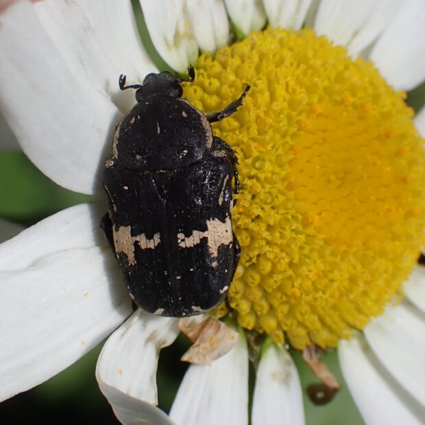 コガネムシ科の甲虫。 全身黒色で、 上翅(じょうし)にクリーム色の紋があるハナムグリ。 花に集まり、 花の蜜や花粉を食べます。 ハナムグリの仲間は、 前ばねを閉じたまま、 後ばねを出して飛びます。