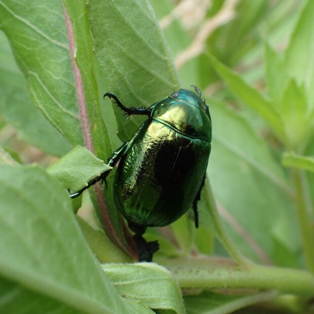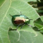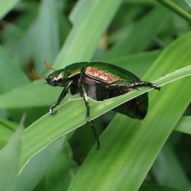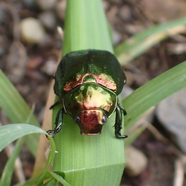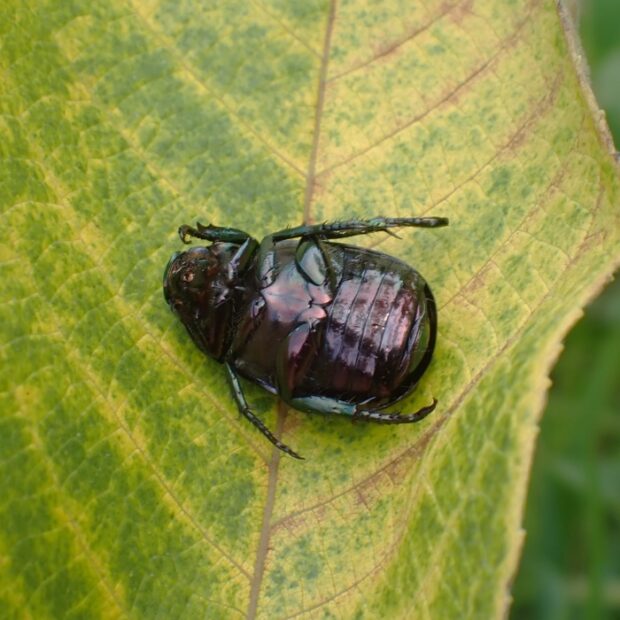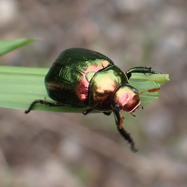 体が丸っこく、 全身が緑色や赤紫に輝くコガネムシ。 河川敷など開けた場所で見られ、 いろいろな広葉樹の葉を食べます。
