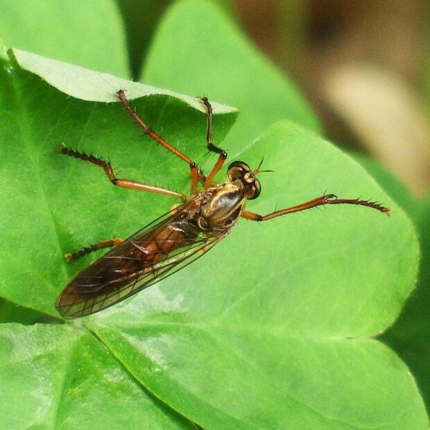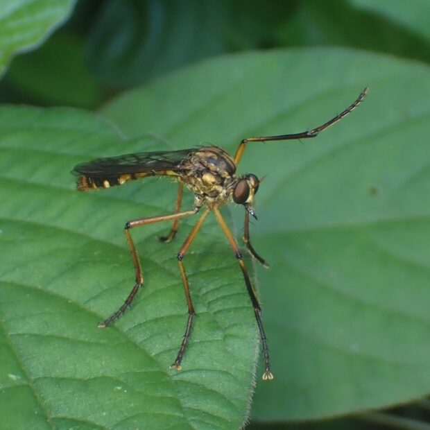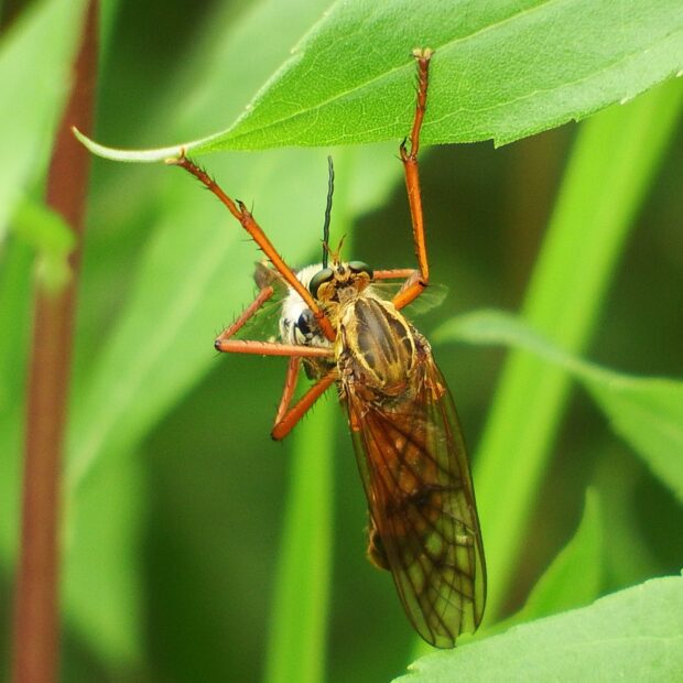 片方の前あしをあげて葉にとまり、 獲物を待ち伏せするムシヒキアブ。 ハチ類を好んで捕らえ、 体液を吸います。 片方の前あしだけでぶら下がり、 獲物を捕食することがあります。 林縁などで見られます。