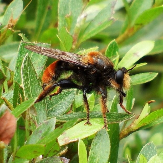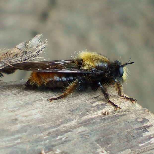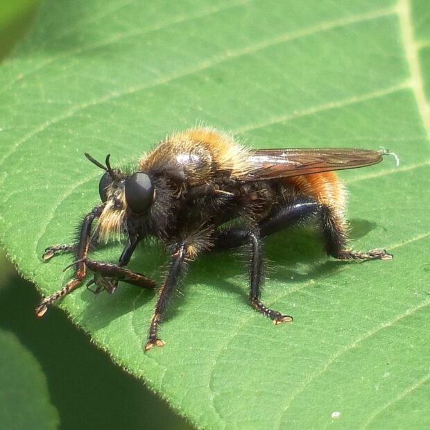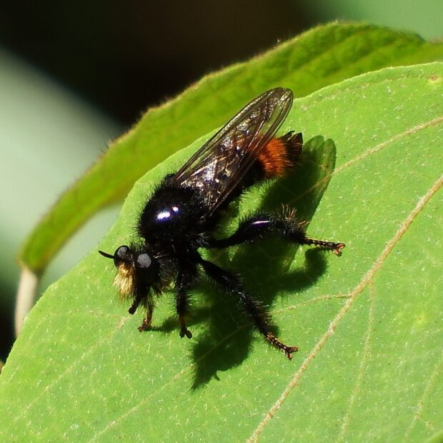 初夏に多い黒色で大きなムシヒキアブ。 体はオレンジ色と黒色の毛、 顔には淡い黄色の毛がはえています。 林縁など日当たりのいい場所で待ち伏せをし、 虫が飛んでくると捕えて体液を吸います。 人は刺しません。