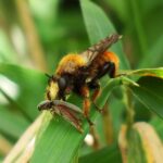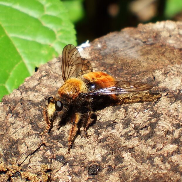 黒色とオレンジ色の毛むくじゃらで大きなムシヒキアブ。 腹部(第2節以降)にはオレンジ色の毛、 顔には淡い黄色の毛がはえています。 見晴らしのいい所で待ち伏せをして獲物を捕え、 体液を吸います。 人は刺しません。