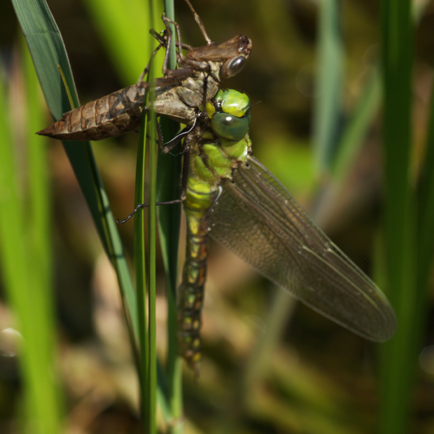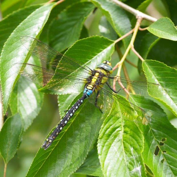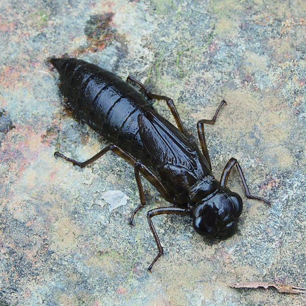 胸に2本の黒い筋があるヤンマ科のトンボ。 ギンヤンマは明るい水辺を好みますが、 本種は木陰があるうす暗い小さな池を好みます。 黒い腹部に、 オスは鮮やかな青い斑紋、 メスは黄緑色の斑紋があります。