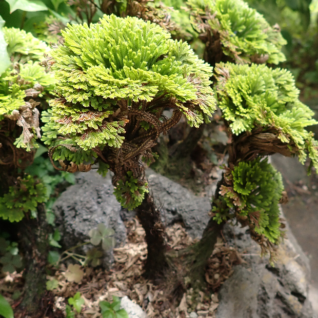 イワヒバは盆栽の世界では「巻柏」と書き、 よく育てられます。 江戸時代には古典園芸植物として赤や黄の模様のあるもの、 枝が大きく曲がるものなどたくさんの園芸品種がつくられました。 その数は200以上あり、 今でも新しい園芸品種が登録されています。
