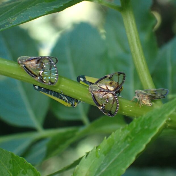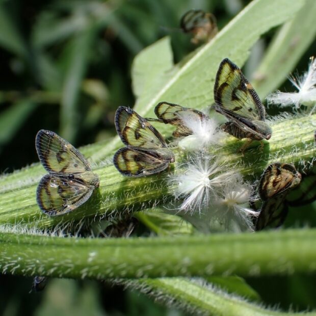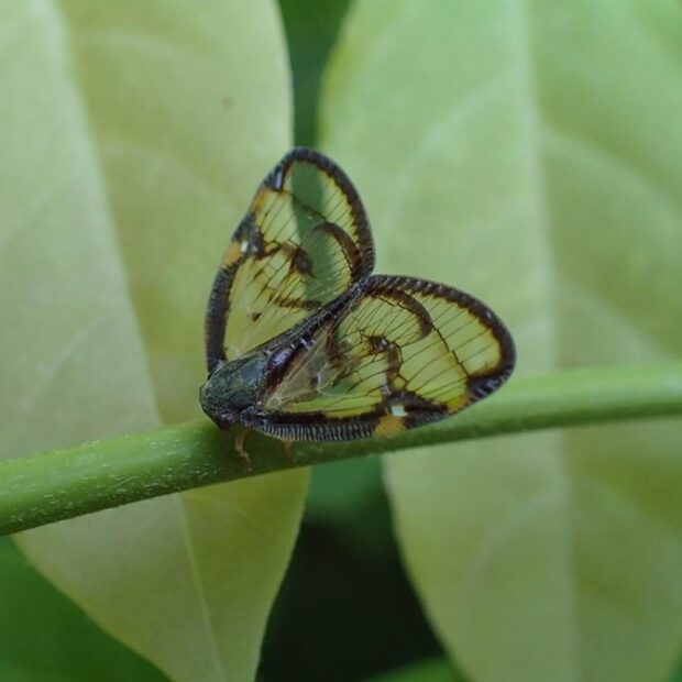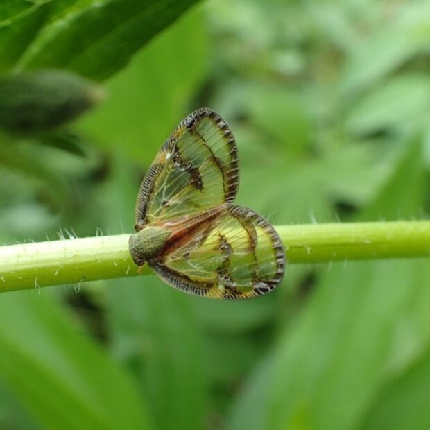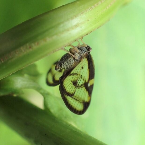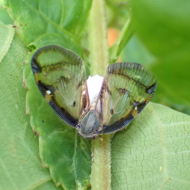 黒褐色の帯で縁どられた透明のはねをもつハゴロモの仲間。 成虫は夏にあらわれ、 木の汁を吸います。 幼虫は淡い黄緑色の体に、 ロウ物質でできた白い毛束をつけており、 ピョンと跳んで逃げます。