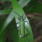 メタリックな緑色の大きなカミキリムシ。 赤い色をしたのもいます。 幼虫はカエデ類の生木を食べて育つため、 公園や庭の植栽されたイロハモミジなどで見られることがあります。 午後から夕方にかけて、 クリ、 リョウブ、 ノリウツギなどの花に集まります。
