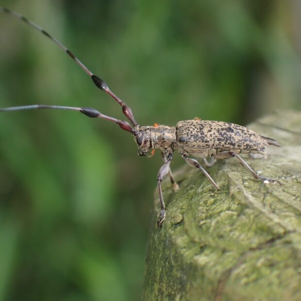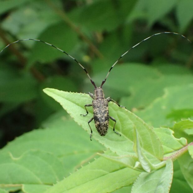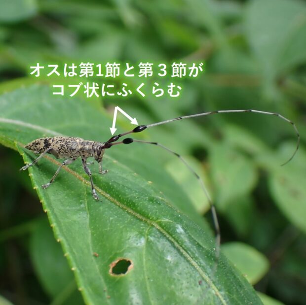 触角が長~い、 まだら模様のカミキリムシ。 平地~山地に生息し、 雑木林などで見られます。 前胸の背中に3本のスジがあるのでセミスジ、 触角にコブがあるのでコブヒゲと名づけられました。 触角のコブは、 オスは第1節と第3節、 メスは第1節だけにあります。