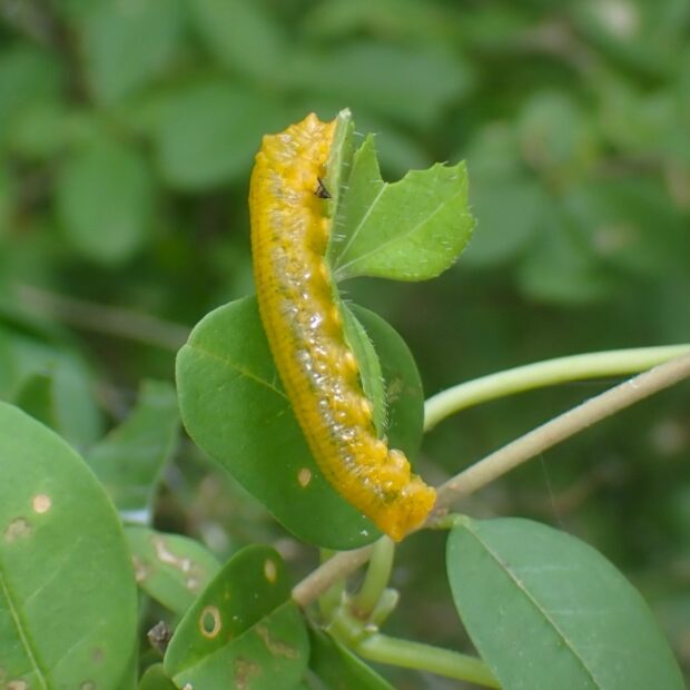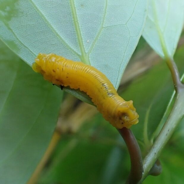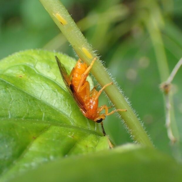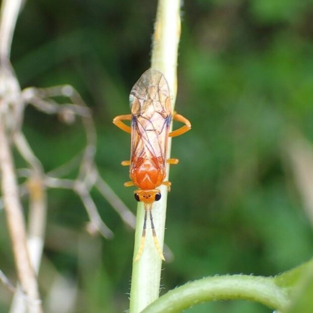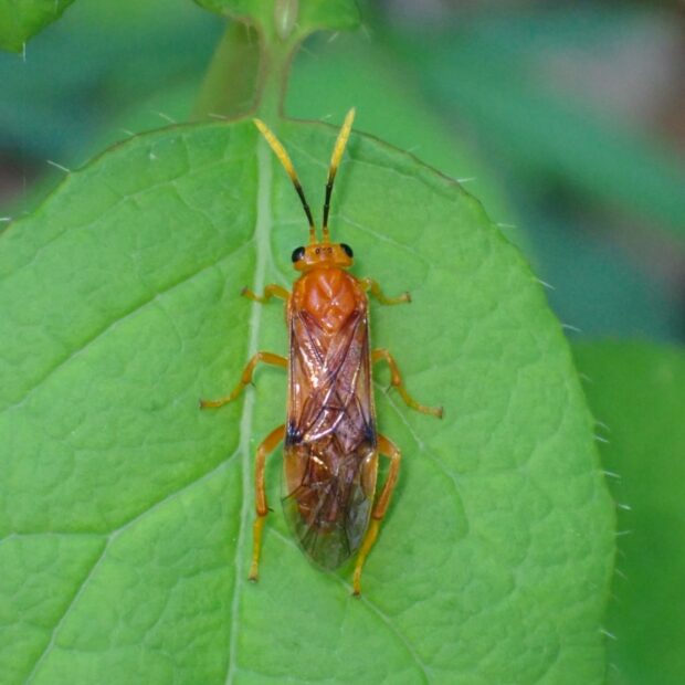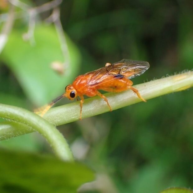オレンジ色のハバチ。 ハバチは腰が細くならない原始的なハチで、 幼虫は植物を食べます。 人を刺すことはありません。 幼虫は黄色で、 集団でスイカズラの葉を食べ、 土の中で繭を作り、 その中で蛹になります。