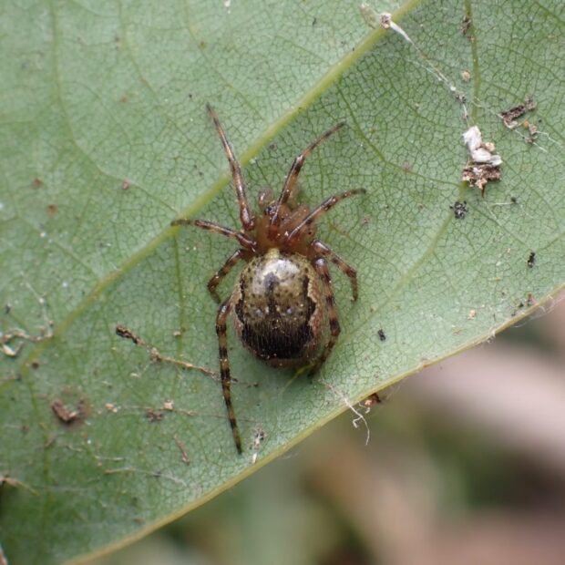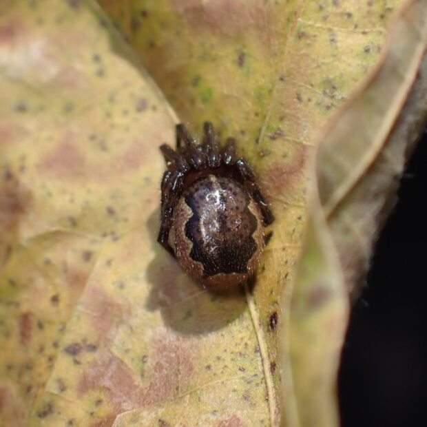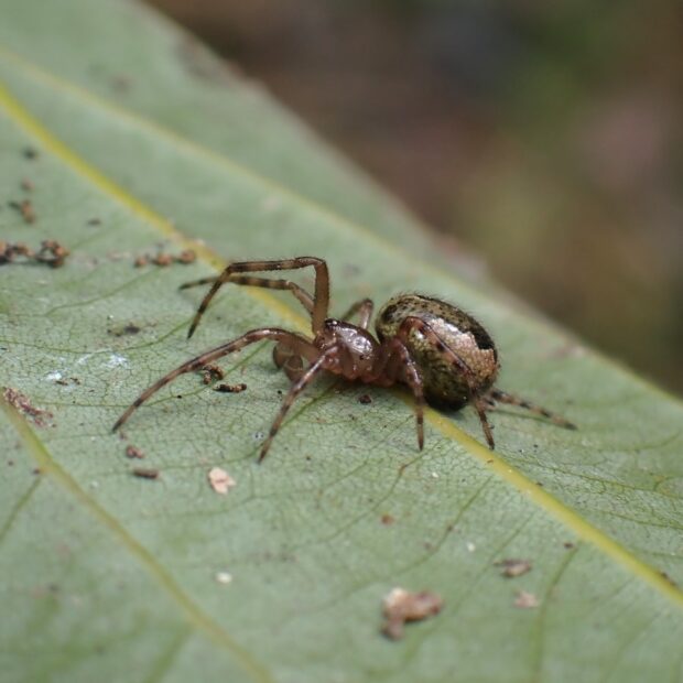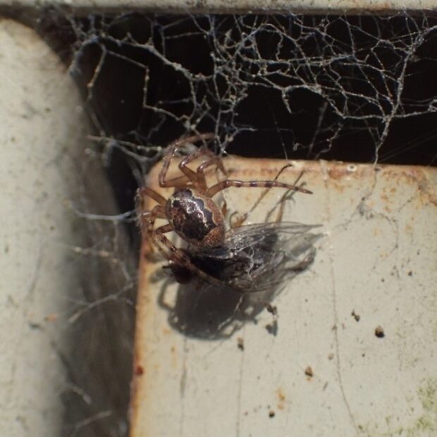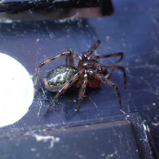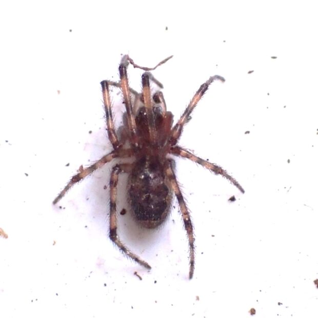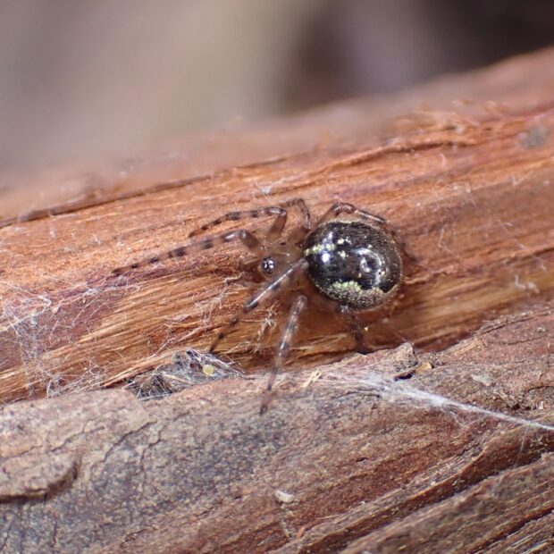 不規則な網を張るヒメグモの仲間。 公園、 人家などの建物の周囲、 木の幹のすきまや樹皮の下などで普通に見られます。 腹部の黒い波型模様が特徴です。