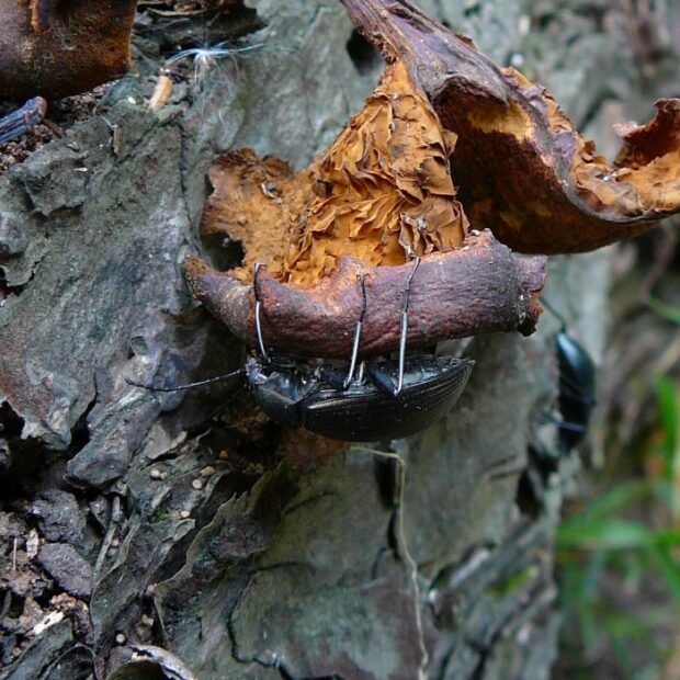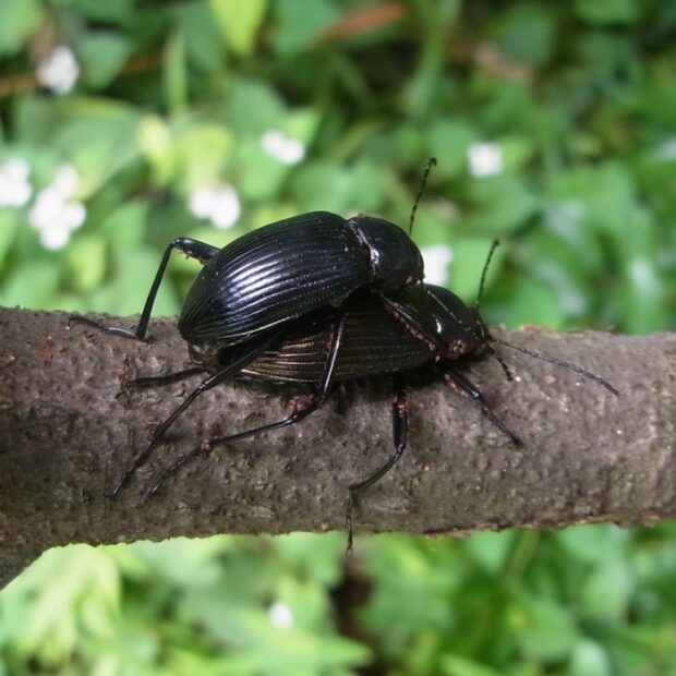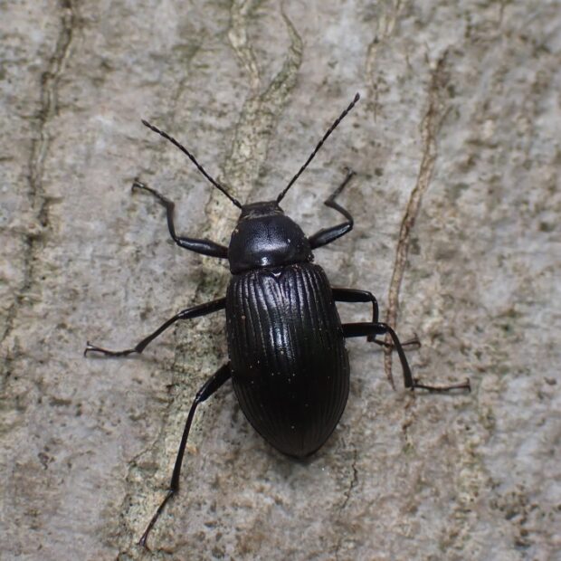 倒木や枯木の幹を歩き回るゴミムシダマシの仲間。 雑木林~山地で普通に見られます。 あしが長く、 全身黒色で、 銅色や藍色がかった光沢があります。 本州中部以北では青みを帯びた黒色で、 中部以西では銅色をしたものが多いです。 幼虫は朽ち木の中で育ち、 朽ち木の分解の役割を担っています。