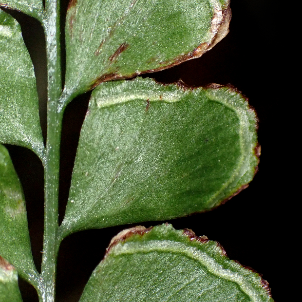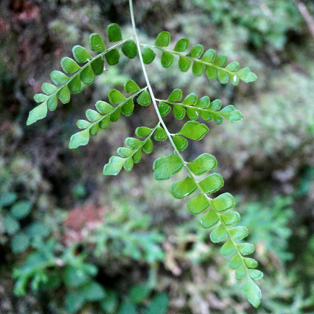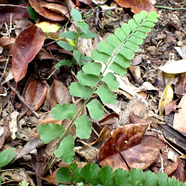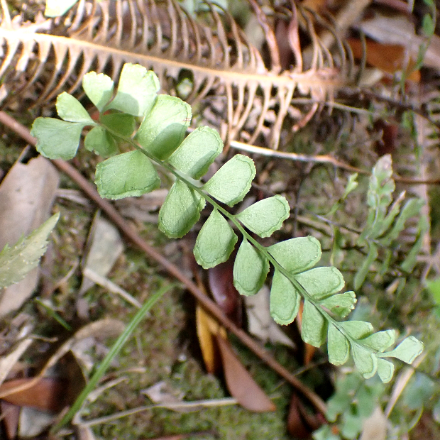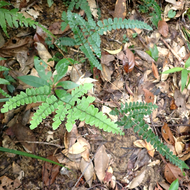 南国の林内に多い小さめのシダ。 近縁のエダウチホングウシダに似ていますが、 扇形の小羽片は先がふつう切れ込まず、 裏のフチに沿って長い胞子のう群をつけます。 名前はエダウチホングウシダに似ているけど新しい種であったことに由来します。