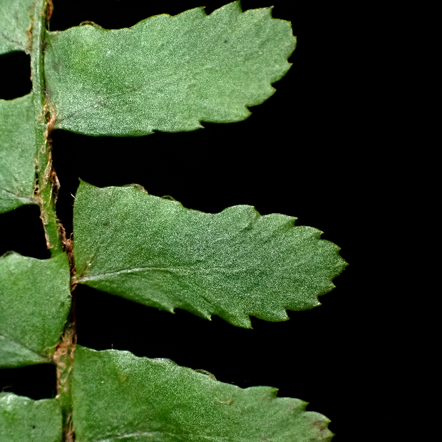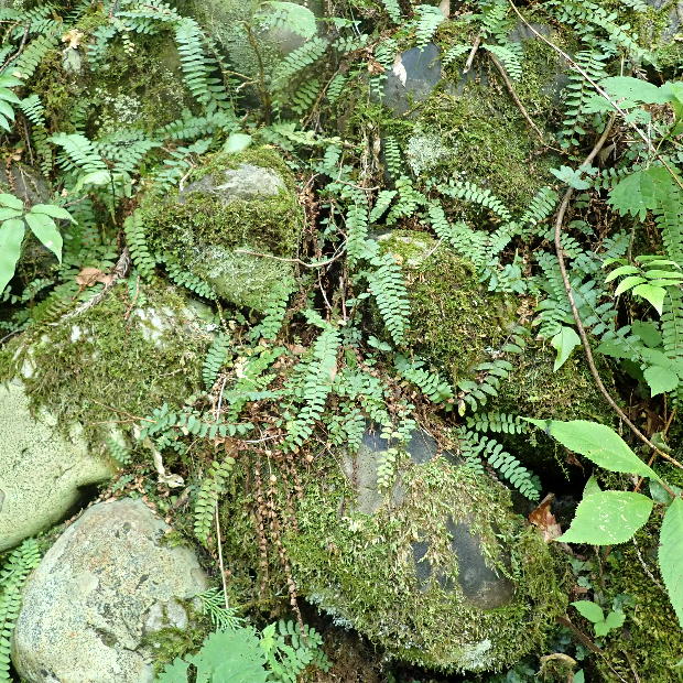 岩にへばりつくように生えていることが多い小さめのシダです。 胞子だけでなく、 葉先に無性芽(むせいが)をつけることでも数を増やします。 見た目はあまり似ていませんが、 イノデの仲間です。