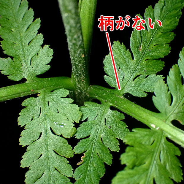 ●ナツノハナワラビは①栄養葉の切れ込みが大きくて先が鋭く尖ります。 ②胞子葉の羽片は長くて横に広がります。 ③柄などに毛は少ないです。