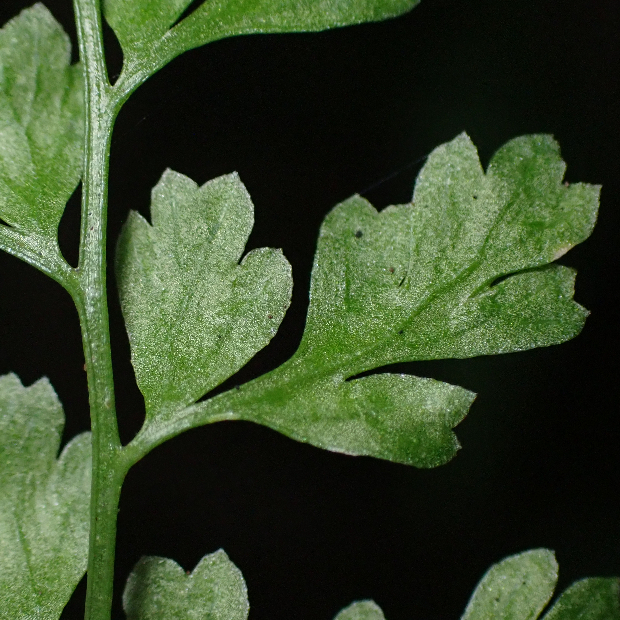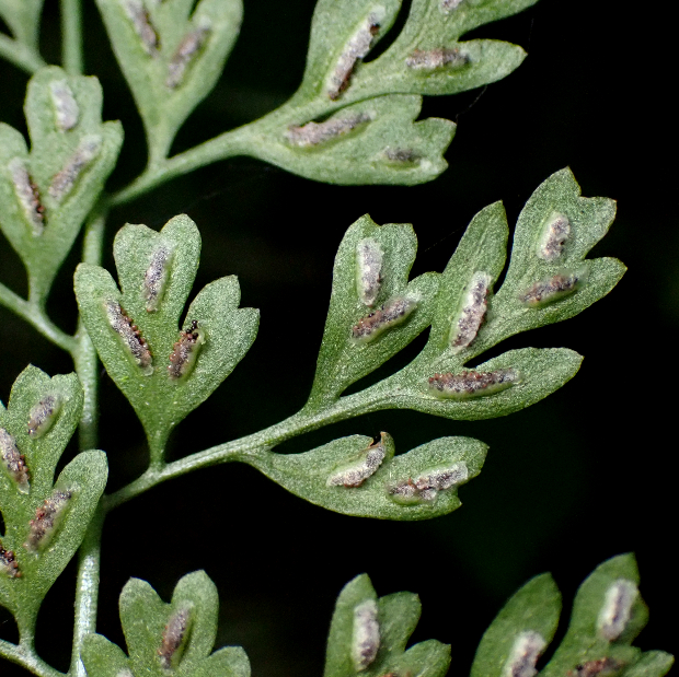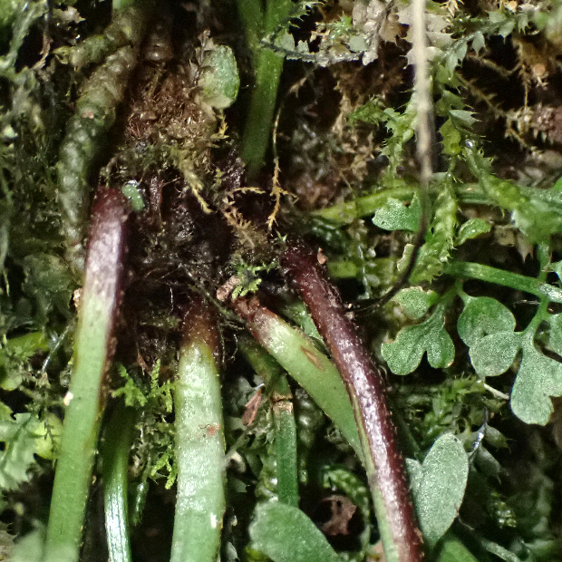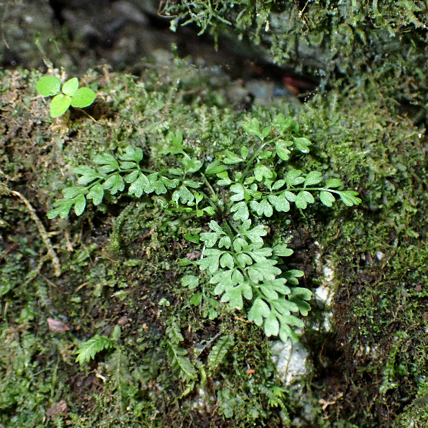 岩の上から小さな葉を出していることが多いかわいらしいシダ。 似たコバノヒノキシダとよく混じって生えていますが、 より小さくて、 葉軸の溝中央は盛り上がりません。