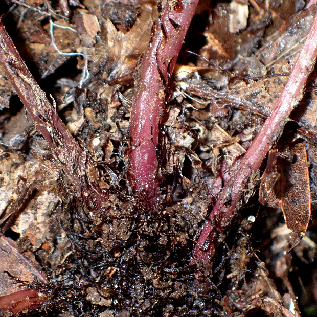 基部が耳状に出るが、 軸にはあまりかぶらない。